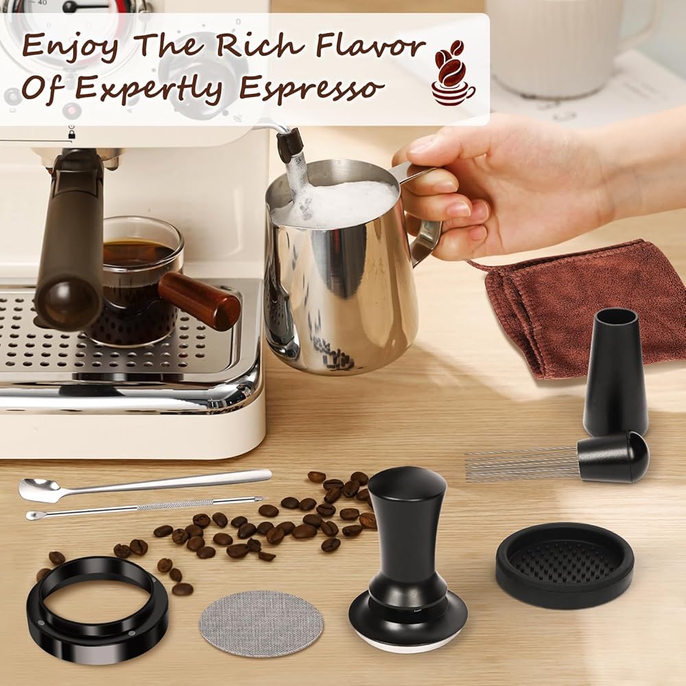 Espresso Machine Accessories:The milk frother is marked with scales on the inside and outside for easy and accurate measurements, it is dishwasher safe. Silicone tamper mat protect the tabletop and portafilter from damage, preventing the portafilter from slipping off when punched. Coffee stirring spoon is the perfect coffee companion. The latte art pens and decorative stencils can create beautiful art patterns for your latte, cappuccino, hot chocolate, impress your friends and family visually