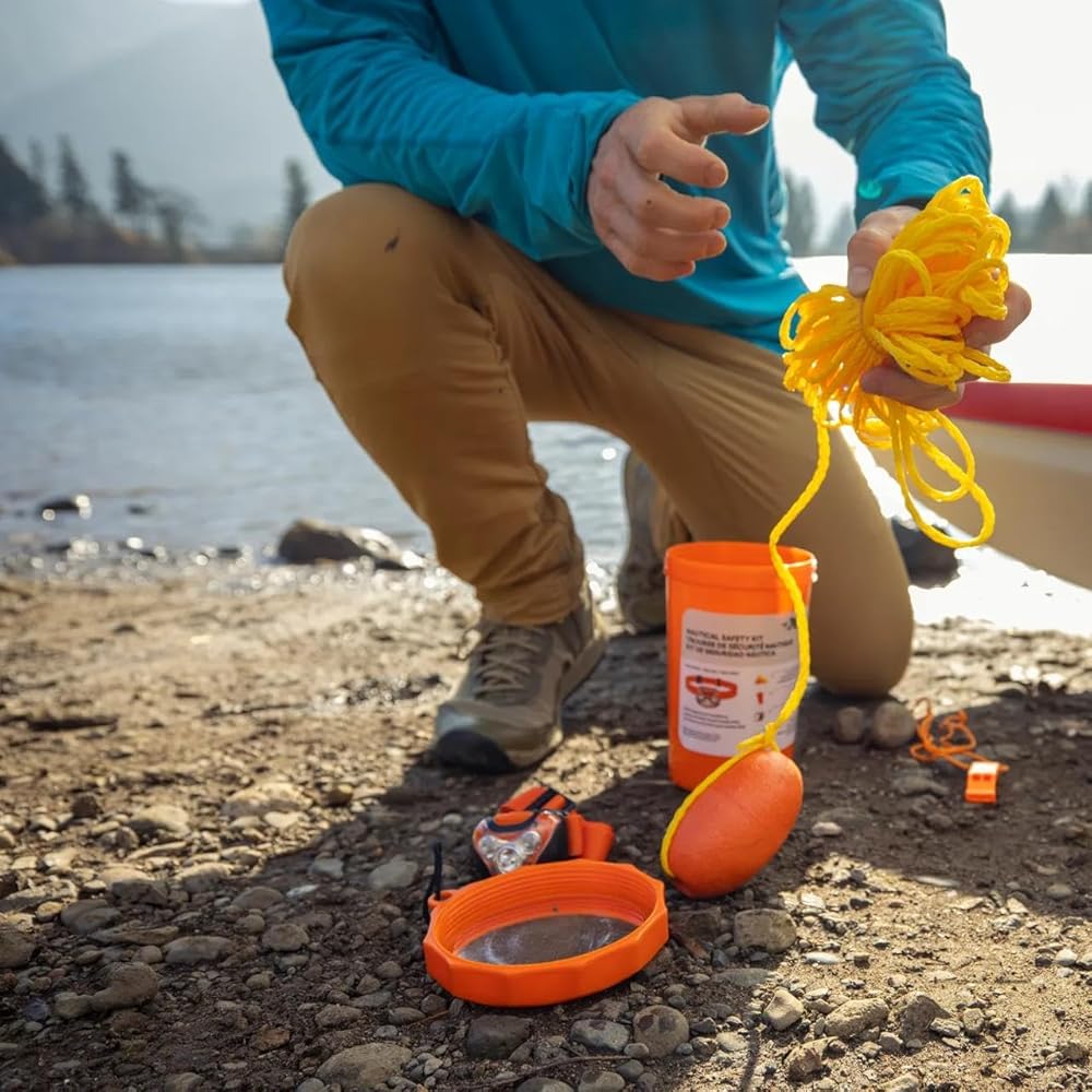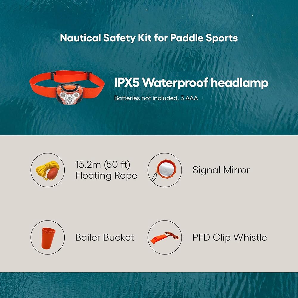 Be fully prepared and confident on the water with our Nautical Safety Kit, designed for paddle sports enthusiasts. This kit features an IPX5 waterproof headlamp with 6 adjustable modes for optimal visibility in low-light conditions, and a signaling mirror integrated into the bailer bucket cap for easy emergency signaling. The 50ft buoyant rope ensures reliable towing and rescue, while the whistle ensures you can be heard in critical situations. Complete with a sturdy bailer bucket for quick water removal, this kit contains everything you need in case of an emergency.