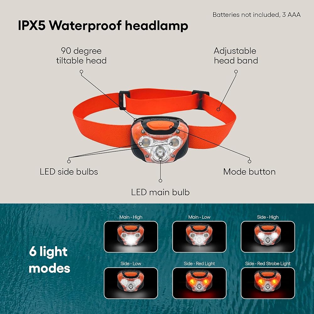 Waterproof Headlamp : Providing essential visibility in low-light emergencies, this IPX5 waterproof headlamp features 6 white and red lighting settings, making it easy to adapt to any situation and ensuring you're seen on the water.