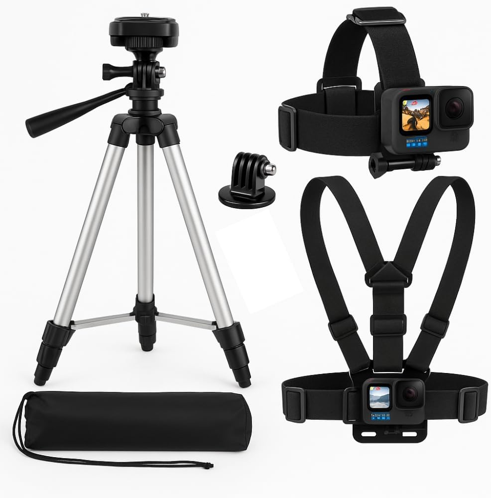 Acuvar 4 Pack Action Camera Accessory Kit – 50" Tripod Camera Tripod Stand for Action Cameras GoPro Accessories Kit with Go Pro Mounts Chest Mount Harness Head Strap Compatible with All Action Cameras