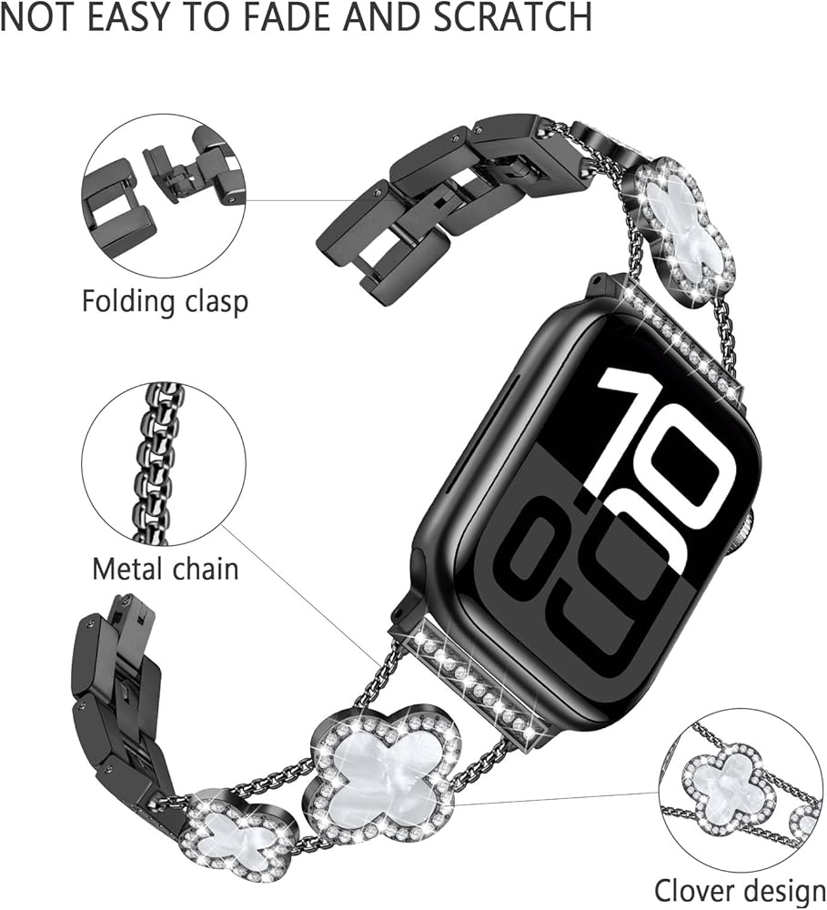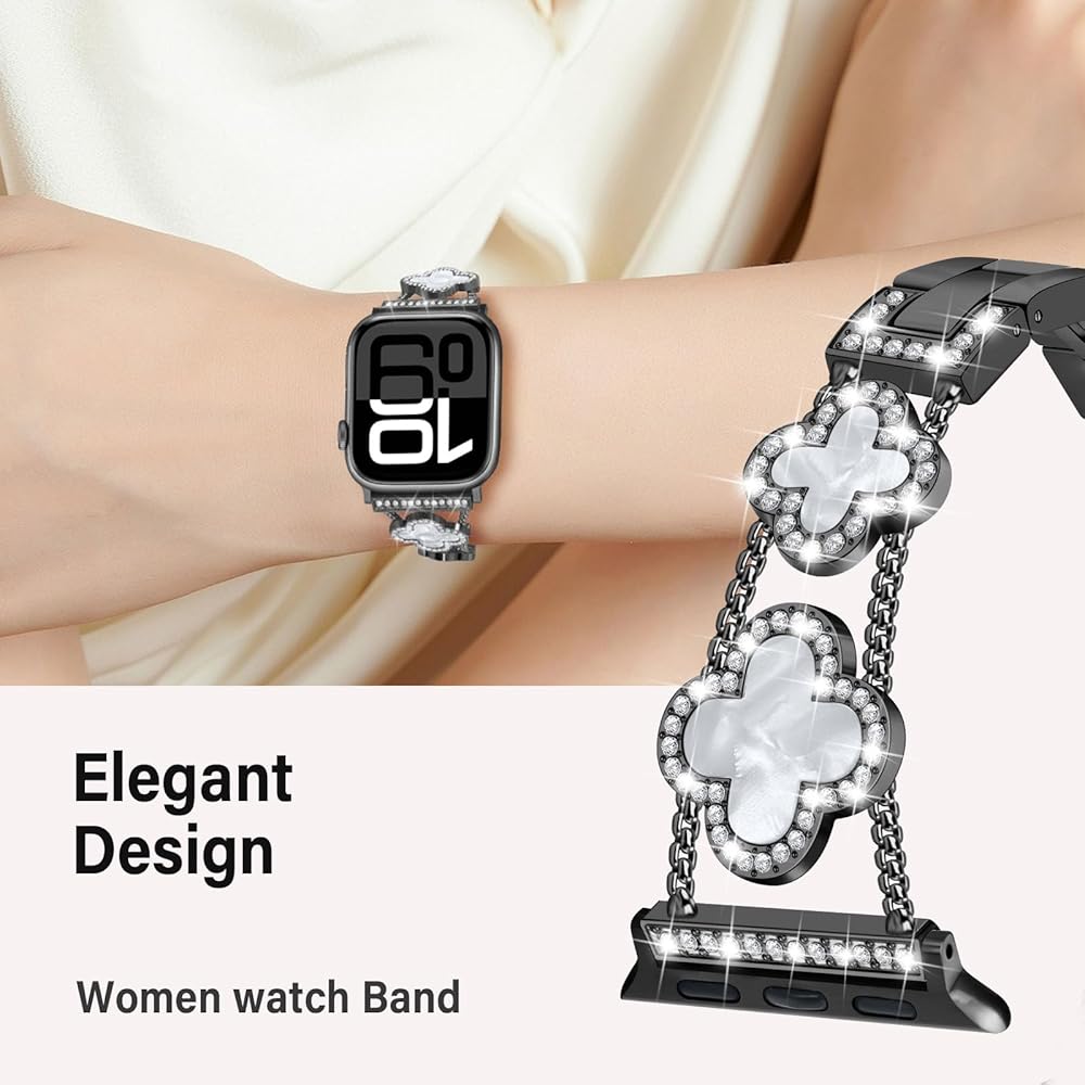 Bands Compatible with Apple Watch Band for Women 38mm 40mm 41mm 42mm 44mm 45mm 46mm 49mm, Bling Bracelet Designer Dressy Clover for iWatch Band Series SE Ultra 11 10 9 8 7 6 5 4 3 (Black)
