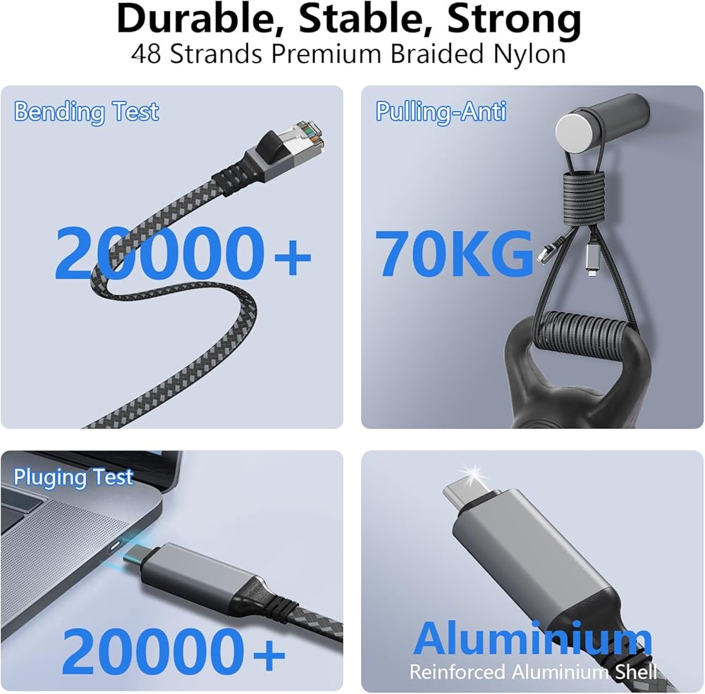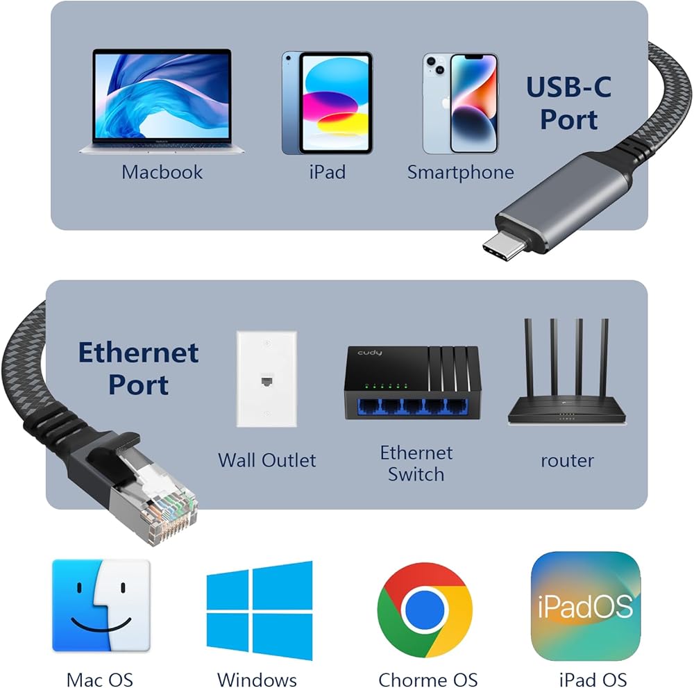 [Universal Compatibility]: This USB C to Ethernet cable works seamlessly with a wide range of devices including Windows, Mac OS, iPad OS, Chrome OS, and Android. Compatible with popular models such as MacBook Pro, MacBook Air, iPhone 15 series, iPad Pro, Dell XPS, Surface Book, Google Pixelbook, Samsung S22, and many more USB-C laptops, tablets, and smartphones.