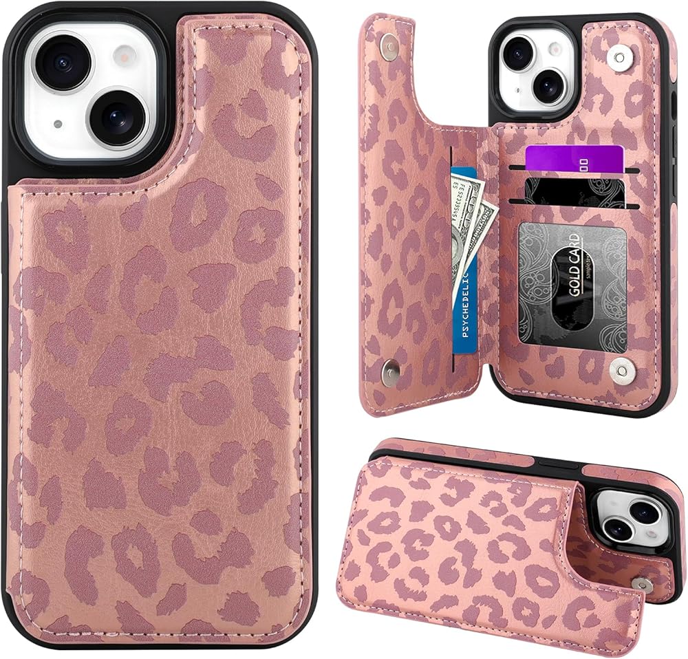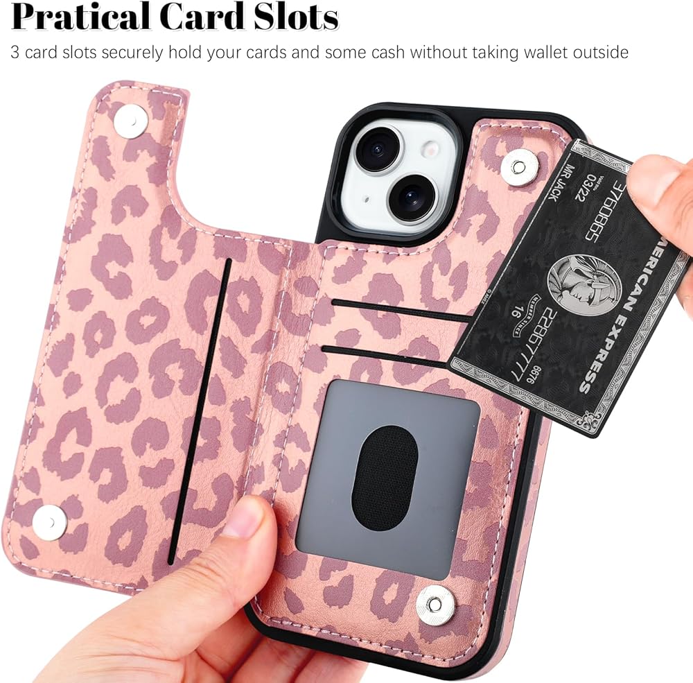 【Practical Card Holder】The leopard iPhone 15 Pro Wallet Case has 3 cards slots, it can securely hold your ID cards, credit cards, and some cash without taking an extra wallet outside. The build-in double magnetic clasp can hold your cards in and does not pop open