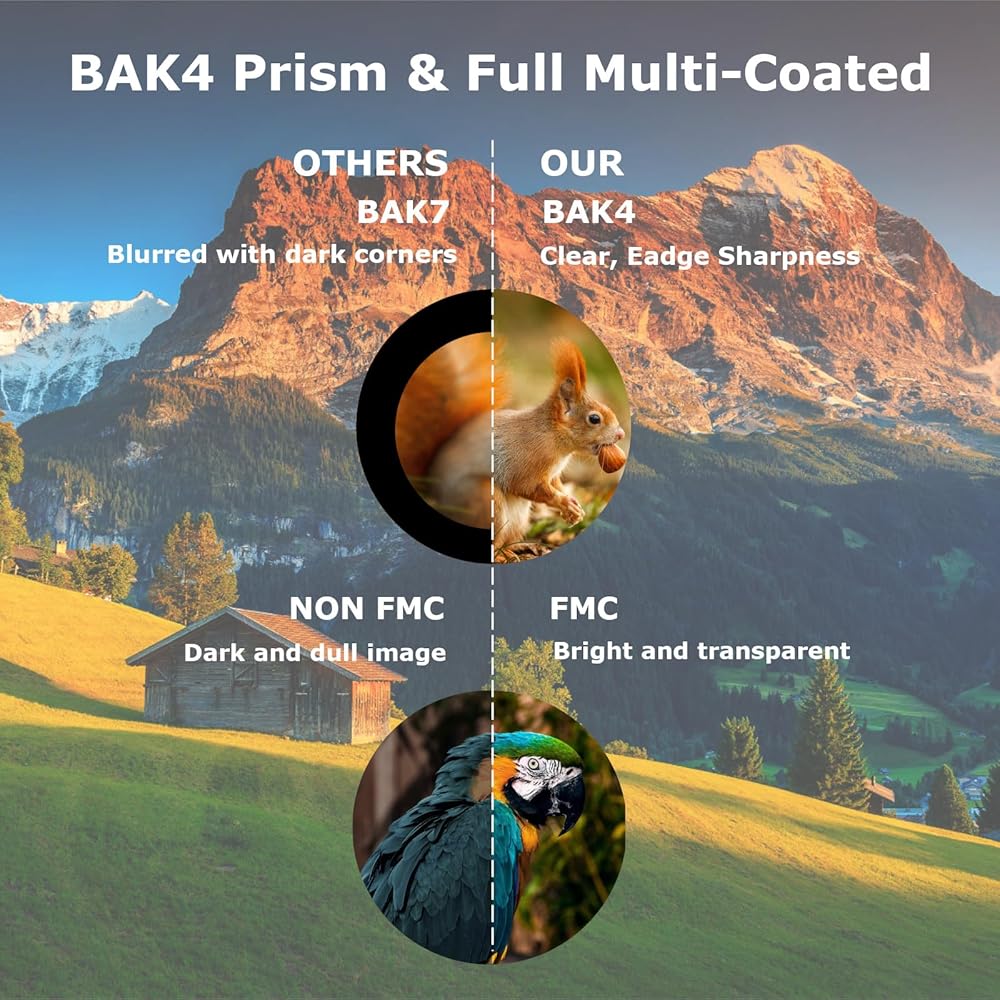BAK-4 Prism & Premium FMC – Equipped with BAK-4 prisms and Fully Multi-Coated (FMC) lenses, our high powered binoculars ensure top-notch light transmission and minimal reflection. Get ready for high-contrast, color-accurate visuals that stay clear and sharp, even in challenging light conditions or when viewing from shaded areas.