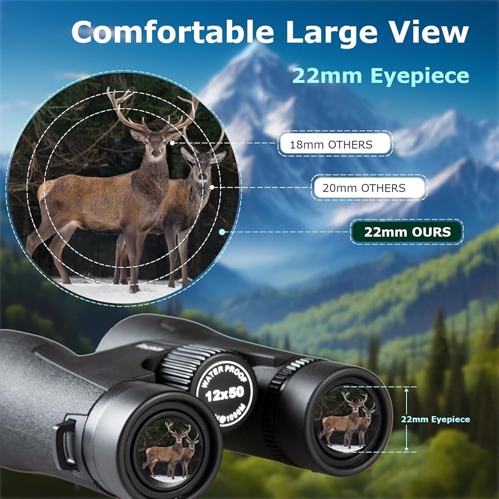 22mm Large Eyepieces & 50mm Large Objective Lens – 12x50 Monocular is equipped with larger eyepiece and objective lens than ordinary monocular, which secures more light transmission and a brighter and larger field of view. High powered monocular telescope provides 50mm objective diameter wide lens, 325ft/1000yards of large field of view, delivers best view in bird watching star watching.