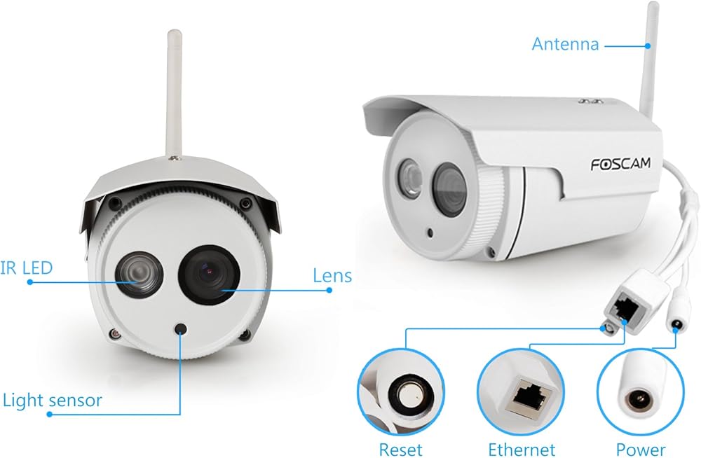The Foscam FI9803P Wireless IP Camera is the expansion of the Foscam outdoor camera range, alongside the FI9805W with 1.0 Megapixels resolution. The Foscam FI9803P Outdoor Megapixel Wireless IP Camera adopts a 720p HD video quality (1280 x 720) as well as a high performance media processor, and high speed video protocol processor. As a result, it is capable of H.264 video compression allowing for extremely smooth video transmission with minimal bandwidth consumption. In addition, due to the small file sizes produced by H.264 video compression it has the ability to save tremendous hard drive space when doing manual video recording. In brief, the Foscam FI9803P comprises 720p HD video quality, H.264 video compression, wireless N suitability, the ability to remotely view over the Internet, motion detection and night vision images. In addition, you can use your smartphone (iPhone, Android)) or your default browser (Internet Explorer, Chrome, Firefox, Safari) to view the images through an Internet connection. The camera can be used as part of your alarm system at home, office, ... with the ability to monitor over the internet. Box Contains Foscam FI9803P IP Camera; Power Supply; Quick Installation Guide; WiFi Antenna; Mounting Bracket; Ethernet Cable; CD