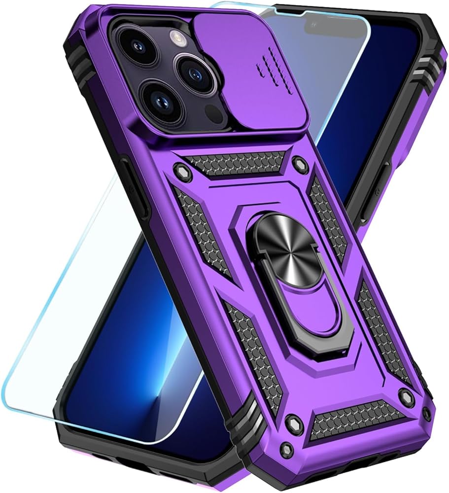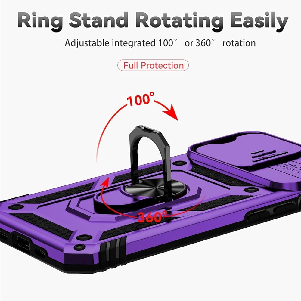 SunStory Compatible with iPhone 13 Pro Case with HD Screen Protector & Slide Camera Cover & Rotated Ring Kickstand, [Military-Grade] Phone Case for iPhone 13 Pro (PurpleBlack)