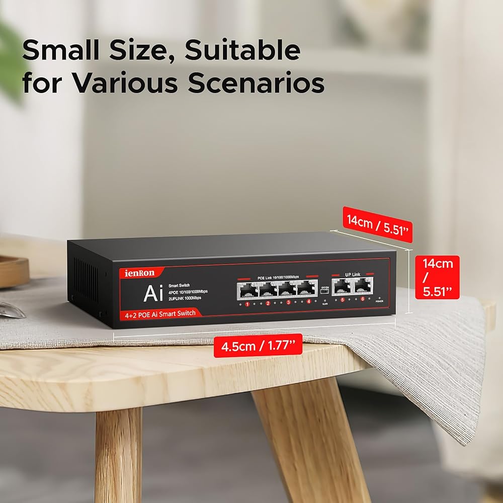 6 Ports PoE Switch, 4 Ports Gigabit PoE Switch with 2 Uplink Gigabit Ports, Plug and Play with AI Detection VLAN Mode Unmanaged Ethernet Splitter Network Switch in Metal Case, Red / Black