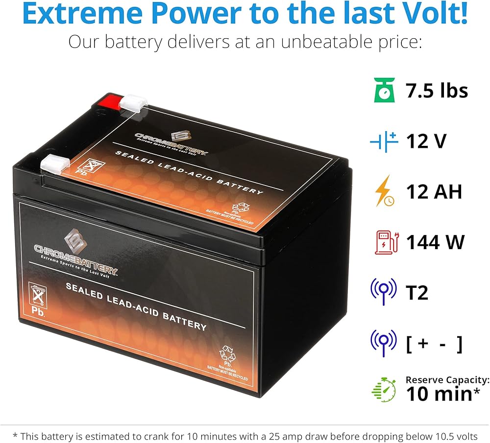 The 12V 12AH Chrome Battery sealed AGM Valve Regulated Lead Acid (VRLA) battery is the ideal power solution for Alarm Systems, Scooters, Toys, Emergency Lights, and More. Built with lead-calcium alloy and AGM (Absorbed Glass Mat) technology, this battery delivers maintenance-free, high-performance reliability. The 12V 12AH AGM battery is rigorously tested to ensure safety, OEM compatibility, and consistent performance in various applications. Designed with a low self-discharge rate and spill-proof construction, the 12V 12AH SLA battery comes fully charged and ready for immediate use. Choose Chrome Battery for trusted durability and dependable power.