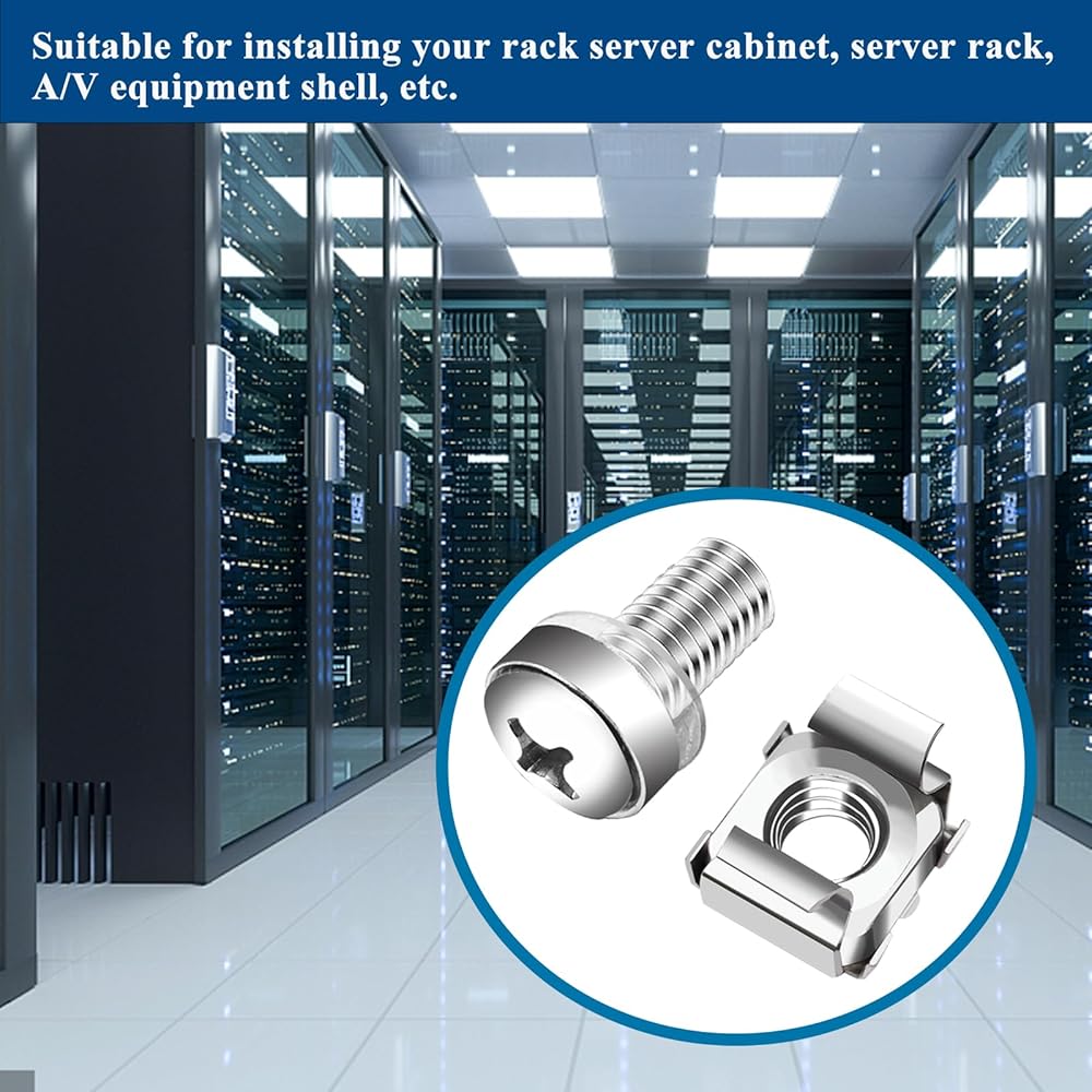 The M6 silver server rack screws kit contains 45 square rack lock nuts, 45 rack mounting screws and 45 black washers. And put it in a plastic box for your convenience