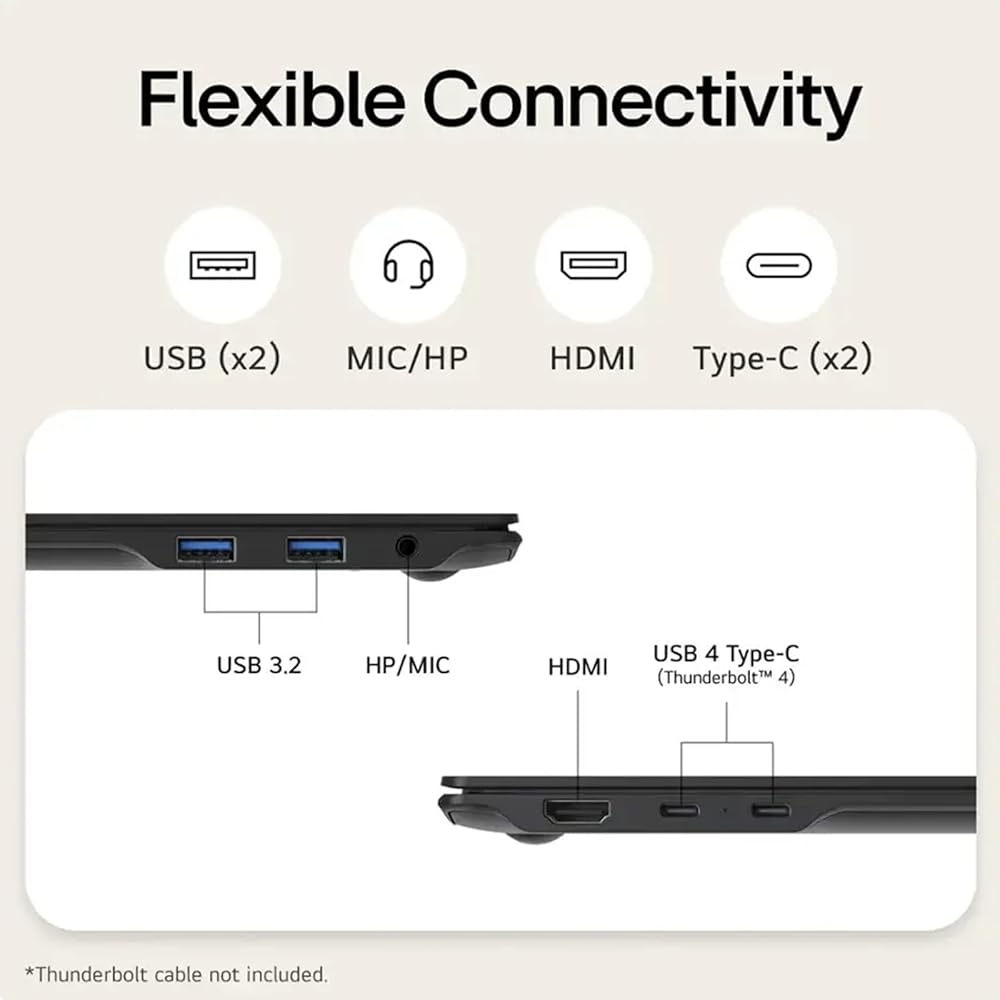 Connectivity: The LG gram 16 features multiple ports, including two Thunderbolt 4, two USB 3.2, HDMI, and headphone options, to boost efficiency and productivity. Thunderbolt 4 compatibility supports ultra-fast data transfer and up to 5K resolution display support.