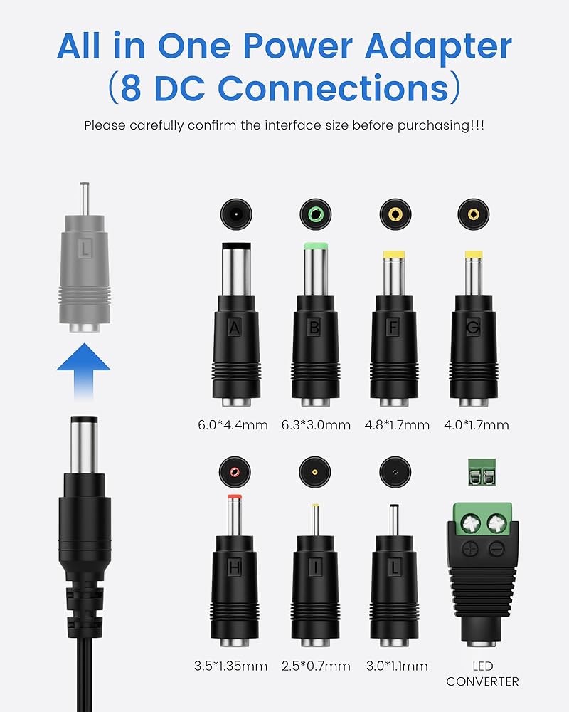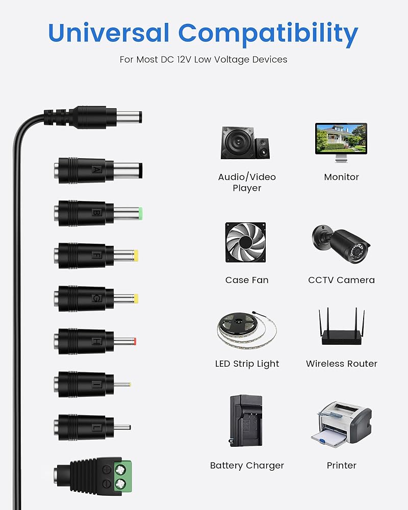【Versatile Application Spectrum】Ideal for a wide array of 12V devices with power requirements under 24W. This includes 12V LED strip lights, routers, ADSL modems, HUBs, security cameras, cameras, DVD players, audio/video power supplies, 3D printers, CCTV security systems, LCD monitors, digital pianos, portable keyboards, IR illuminators, and more.