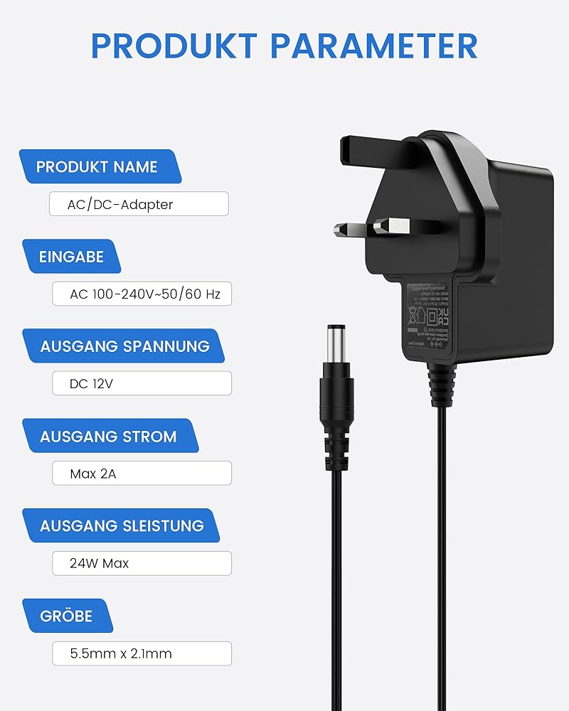 【Robust Power Performance】 Offers an AC input range of 100 - 240V at 50/60Hz, paired with a DC output of 12V, capable of delivering up to 2A (2000mA) with a maximum power of 24W. It's designed to power devices drawing less than 2A, such as those consuming 1.1A, 1.2A, 1.4A, 1.5A, 1.8A, or 2A, ensuring broad compatibility.