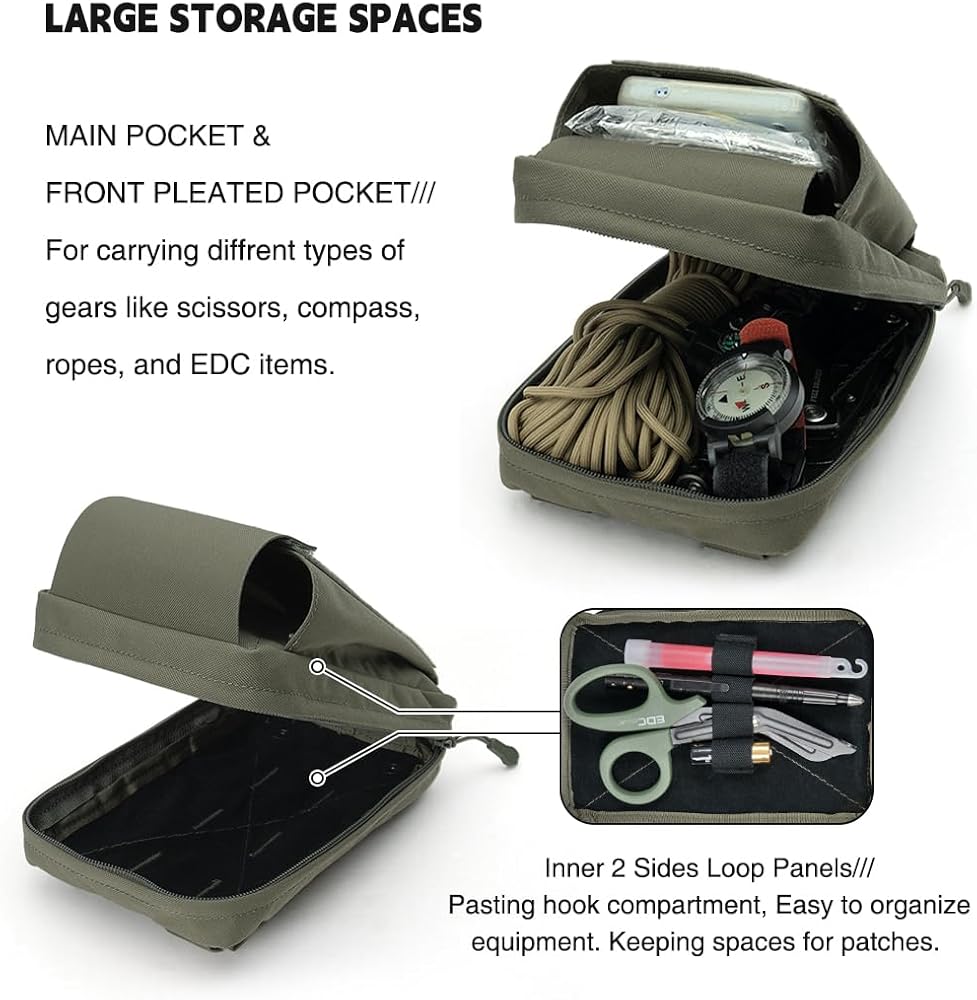 FRONT POCKET: The front pocket of this tactical pouch has a pleated design. And closed by hook and loop cover. About 6''x4.72''x1.57'' when expanded. Provide extra storage space to carry gears, and will not increase volume when you don't use it. The outer loop panel can also paste the patches you need.