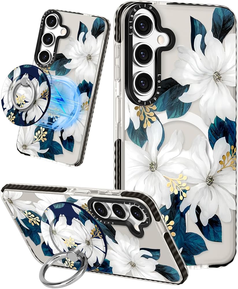 Cute Case for Samsung Galaxy S25 for Women Girls - Funny Blue Flower Design Compatible with Magsafe Magnetic Ring Holder Kickstand Fashion TPU Phone Covers