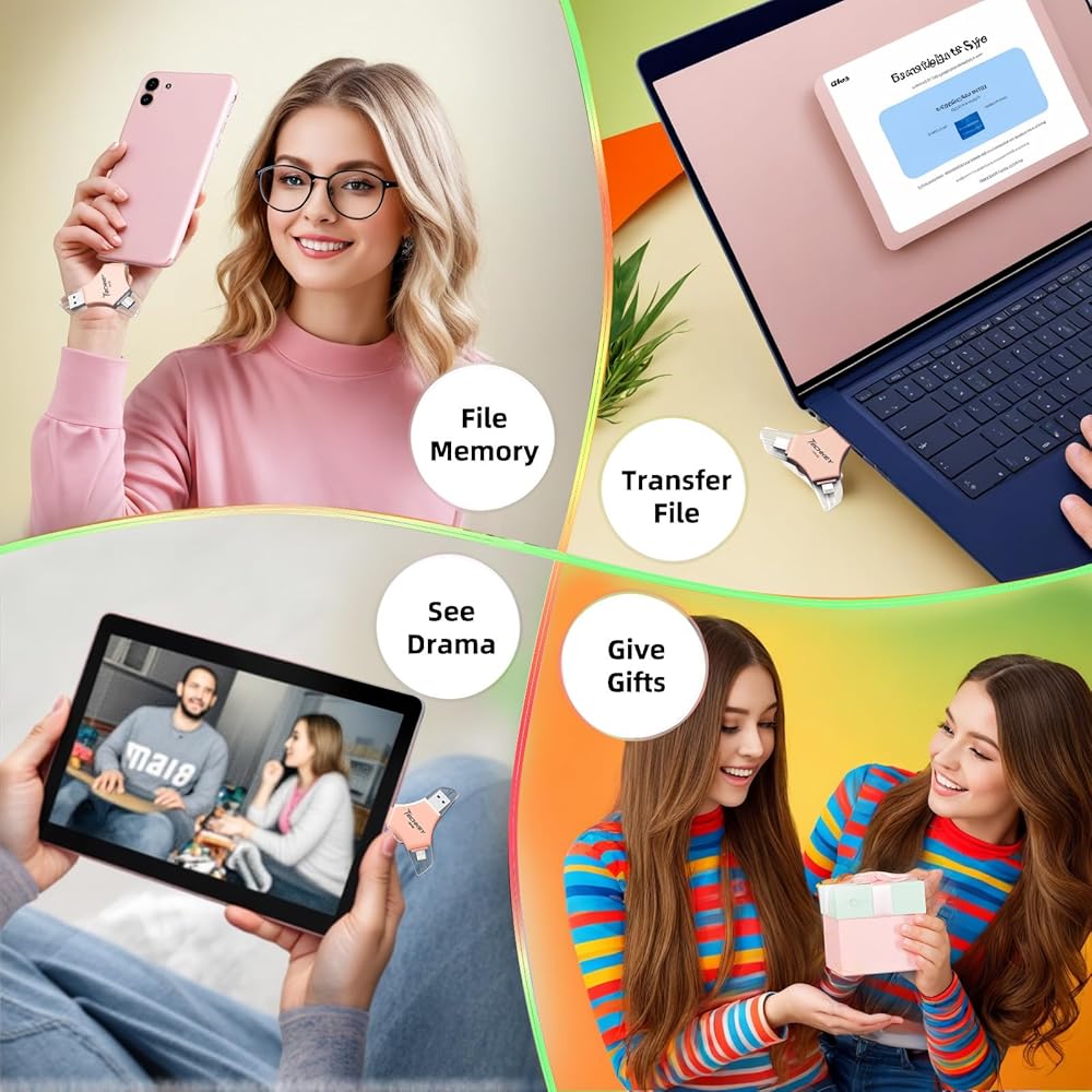 • 【One Click Backup, One Click Sharing】You can easily backup photos, videos, and phonebook to your phone with just one click via the APP, freeing up space on your mobile device without using a data cable or iCloud. You can also share photos/videos/files from the flash drive directly to social media (Facebook, etc.) for easy sharing with family and friends. (Tips: iOS devices need to download the "U-Disk" APP when using flash drive; Android and PC devices do not need to download APP)