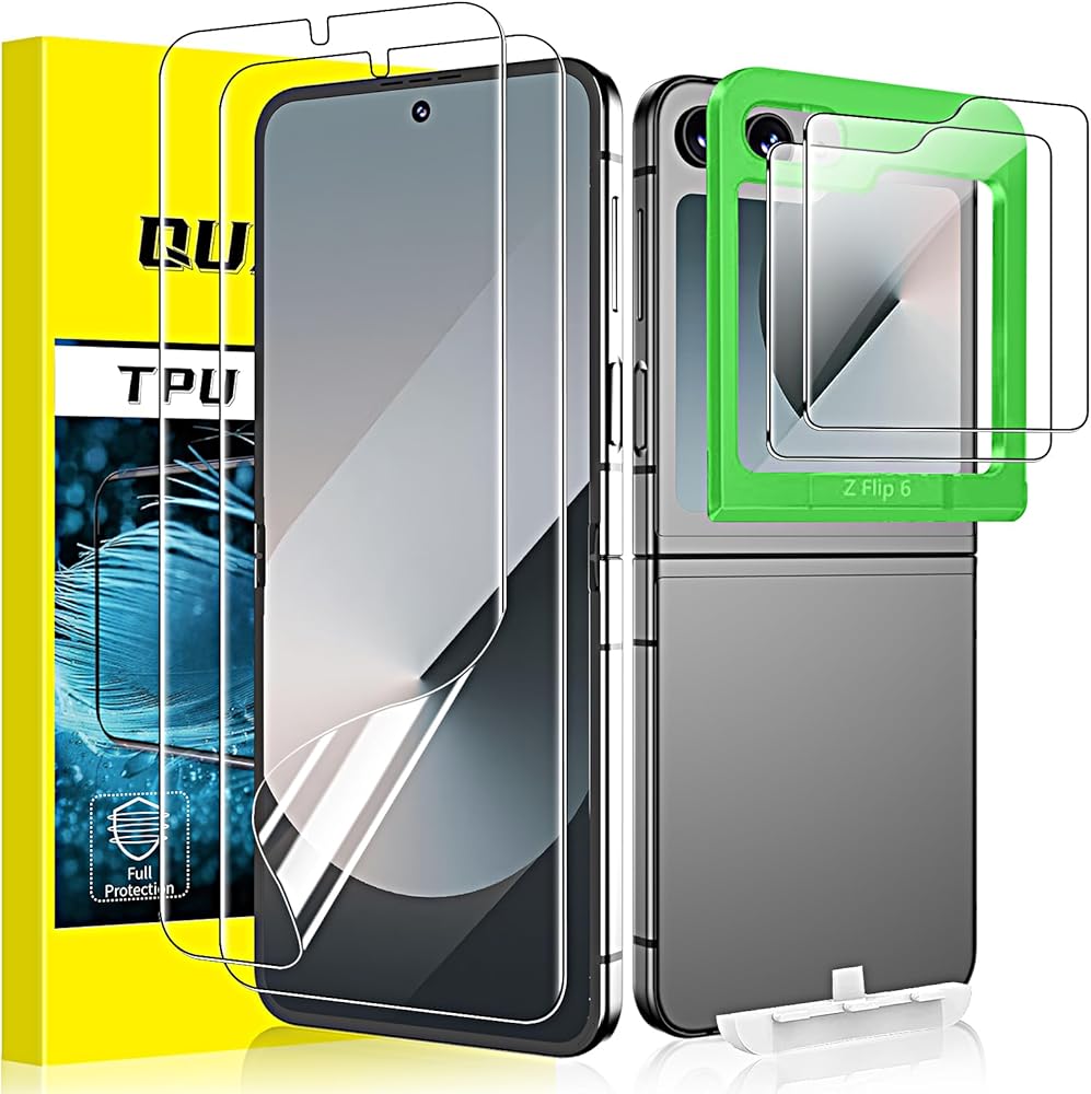 Compatible Model: The screen protector is specifically designed for Samsung Galaxy Z Flip 5, Please check the phone model before buying. The product contains 2 packs of Soft TPU Inside screen protectors and 2 packs back back-tempered glass screen protectors.