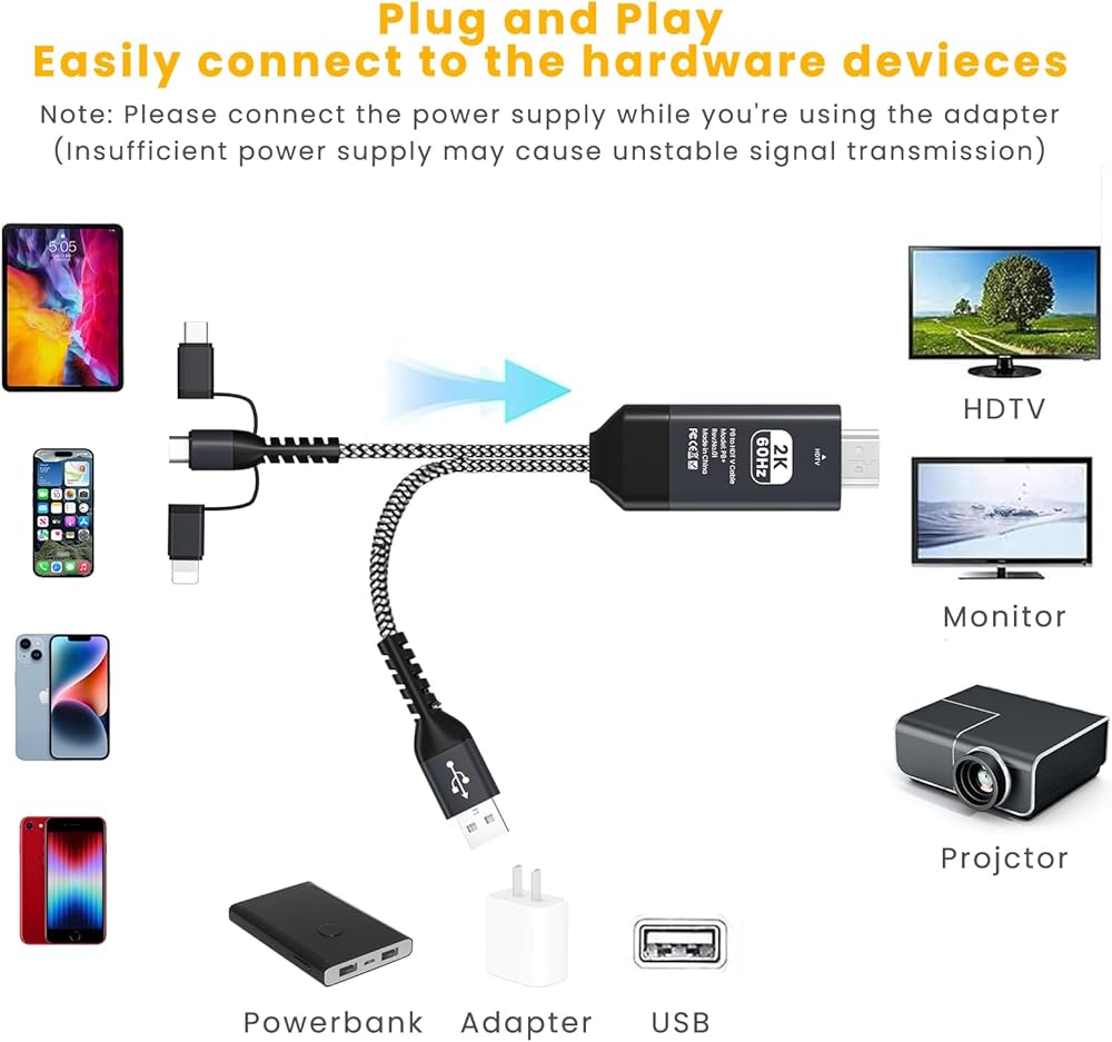 ♚【High Quality at 2K HD】The digital AV adapter supports mirroring what's displayed on the device's screen-including apps, presentations, websites, and more-to TV, projector, or other HDMI-compatible display up to 2K HD (supports simultaneous transfer of audio and video only for i-series-OS mobile phones/tablets, the rest is video only).