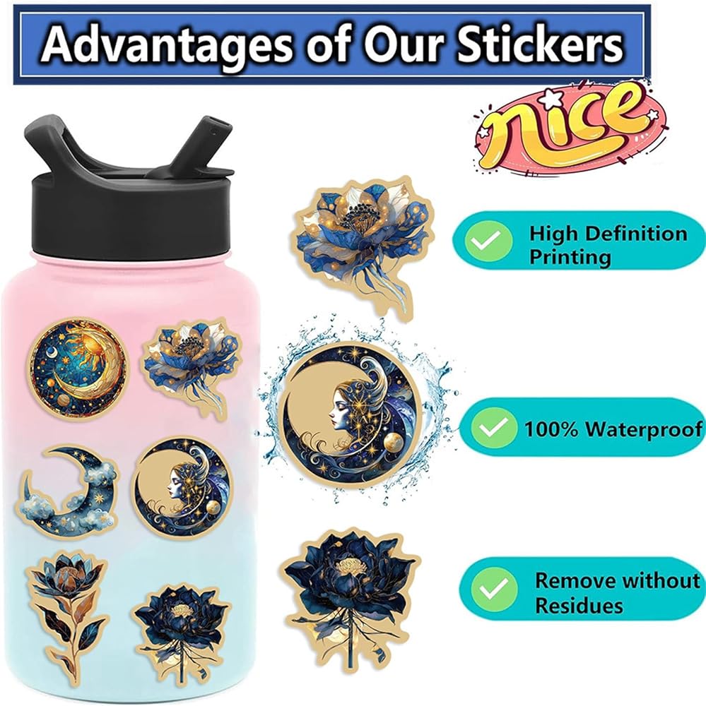 Material & Size: 50pcs Cartoon Celestial stickers for Water Bottles, laptop are made of superior vinyl PVC which is waterproof and sun-proof, and the color hardly fades out. The size of stickers is about 2-2.5 in each