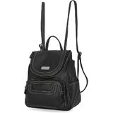 A classic elegant backpack with exterior pockets- Our elegant backpack is 10” L x 10. 25” h x 4. 25” w. Features smart exterior compartments for easy access. The backpack has a front zipper pocket with credit card slots inside, a front slip pocket in front of the zippered pocket, open pockets on both sides, a cell phone pocket, and a vertical zipper pocket