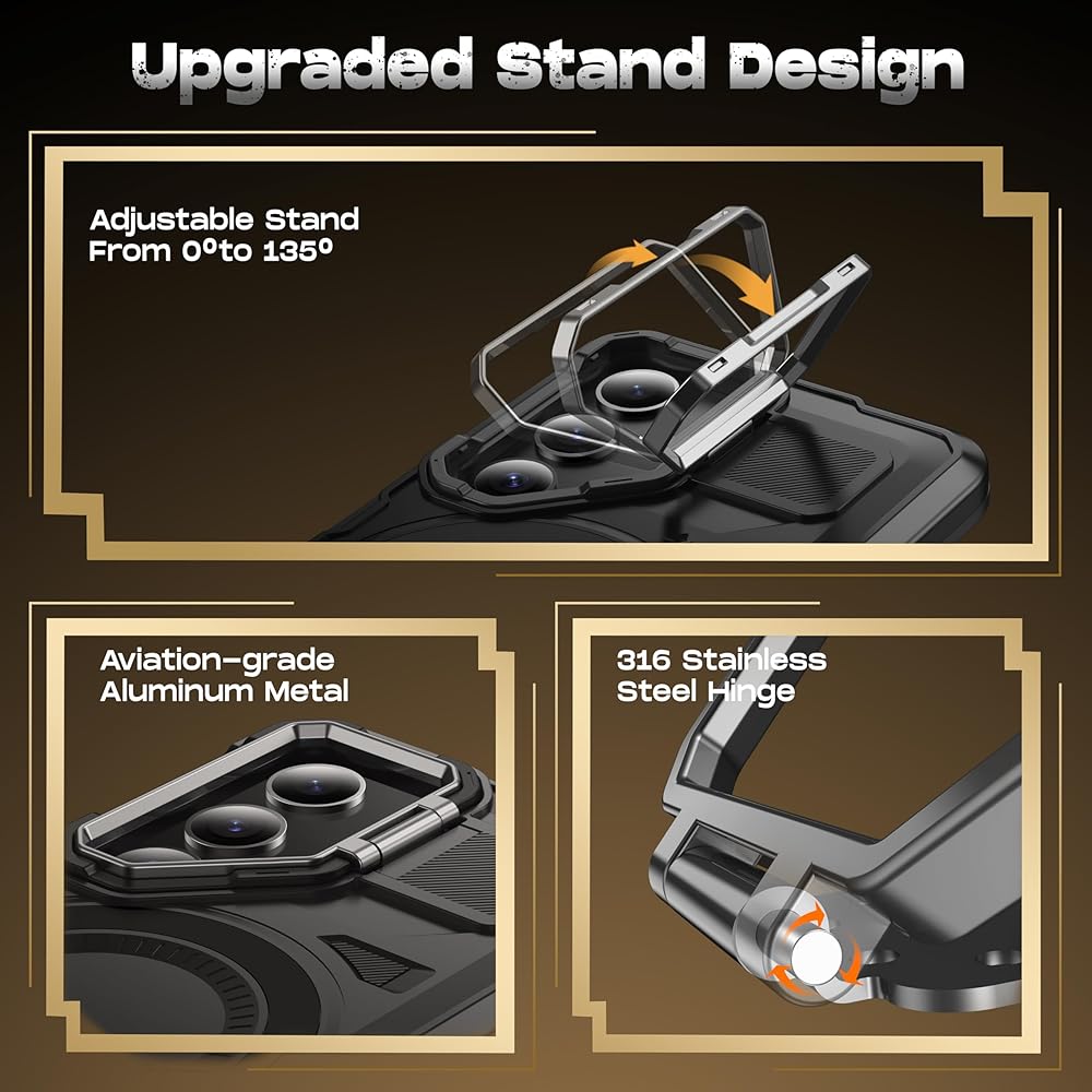 【Built-in Camera Cover Stand】The unique camera cover is made of zinc alloy to effectively prevent lens wear and stains. It is also an adjustable kickstand with an adjustment angle of 0° to 135° to provide you with a comfortable viewing angle. The bracket can also be wirelessly charged while unfolded, making your phone more convenient and efficient to use. The hinge has passed more than 30,000 opening and closing test to ensure your daily use of lasting and reliable
