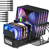 【10-Port Charging Station Organizer】 Unlike charging stations with only USB-A ports, our multi-device charging station features 10 USB-C ports, delivering a total output of up to 100W. It can efficiently store and charge up to 10 devices simultaneously. This multi charger station helps eliminate messy cables and multiple wall chargers, keeping your desk neat and organized.