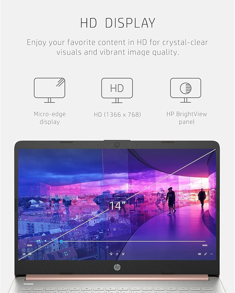 Processor: Intel Celeron N4120 (up to 2.6 GHz burst frequency, 4 MB L2 cache, 4 cores, 4 threads) Graphics: Intel UHD Graphics Operating system: Windows 11 Pro 64-bit Memory: 32GB DDR4 SDRAM Hard Drive: 1600GB Storage (64GB onboard hard drive + 512GB external hard drive + 1TB OneDrive Cloud Storage) Optical Drive: No Display: 14-inch diagonal, HD (1366 x 768), micro-edge, BrightView, 220 nits, 45% NTSC Connectivity: Realtek RTL8821CE 802.11a/b/g/n/ac (1x1) Wi-Fi and Bluetooth 4.2 combo Audio: Dual Speakers Keyboard: US English, NonBacklit Full Size Keyboard Built-in HD Webcam: HP True Vision 720p HD camera with integrated dual array digital microphones Media Drive: Multi-format SD media card reader Ports: 1 x USB 3.1 Gen 1 Type-C (Data Transfer Only, 5 Gb/s signaling rate) 2 x USB 3.1 Gen 1 Type-A (Data Transfer Only) 1 x AC smart pin 1 x HDMI 1.4b 1 x Headphone / Mic Combo Jack Battery: Up to 11.5 Hours Color: Pink Dimensions L x W x H (inches): 12.7 x 8.8 x 0.7 Weight: 3.2 lbs