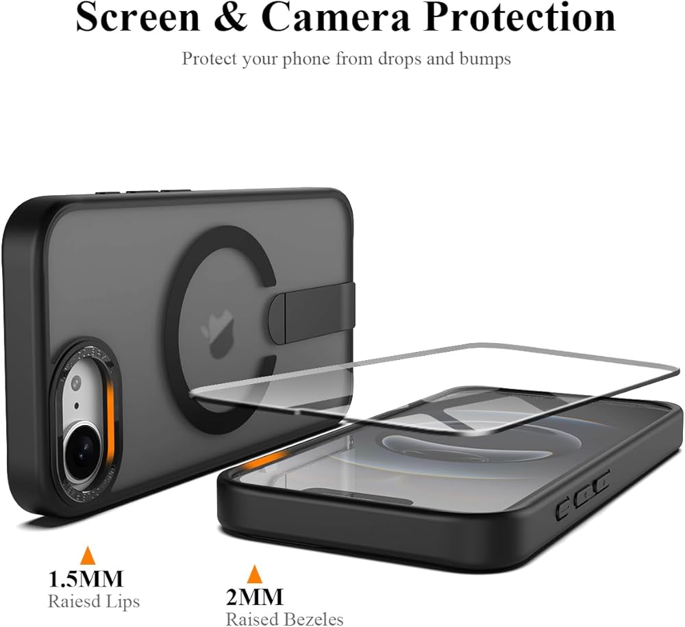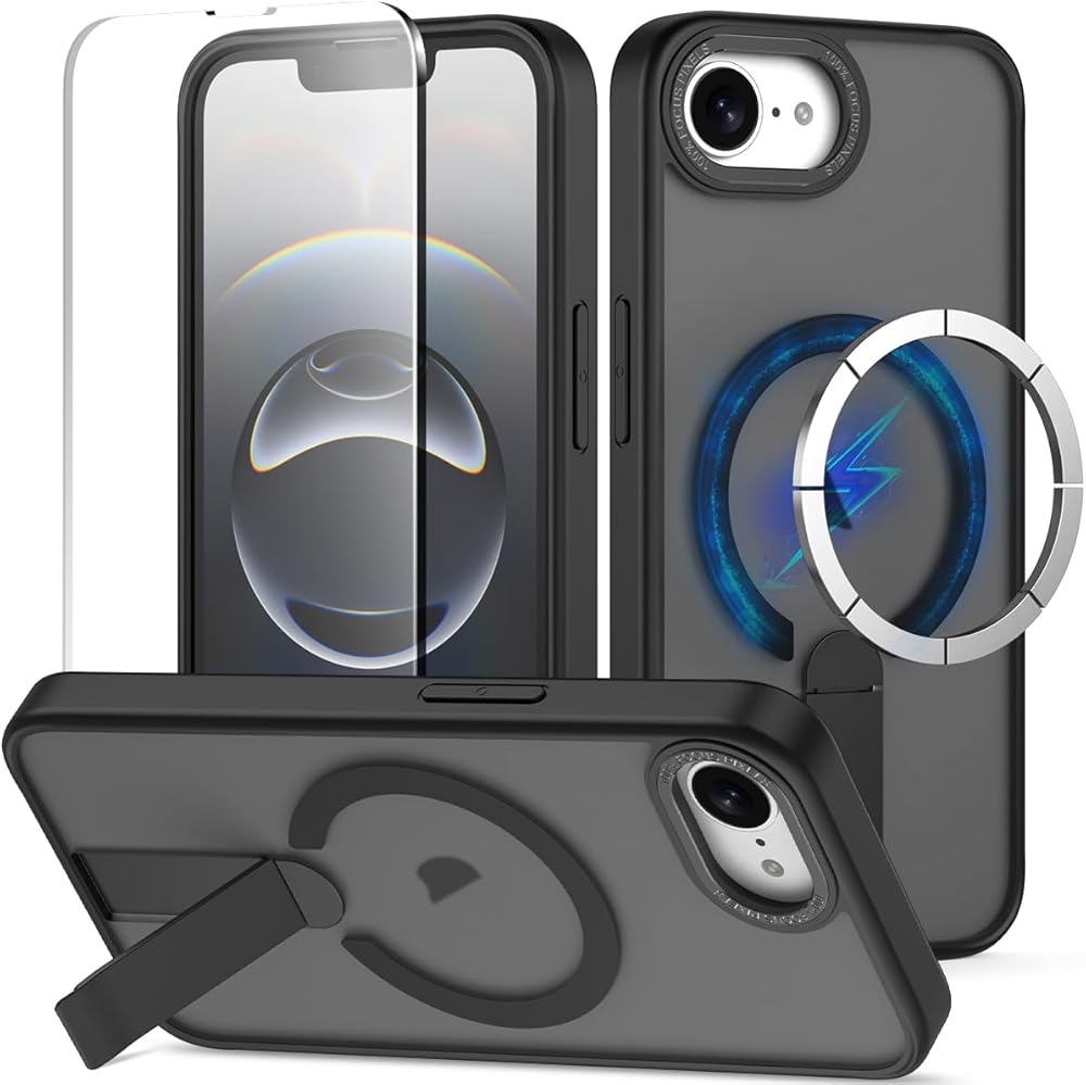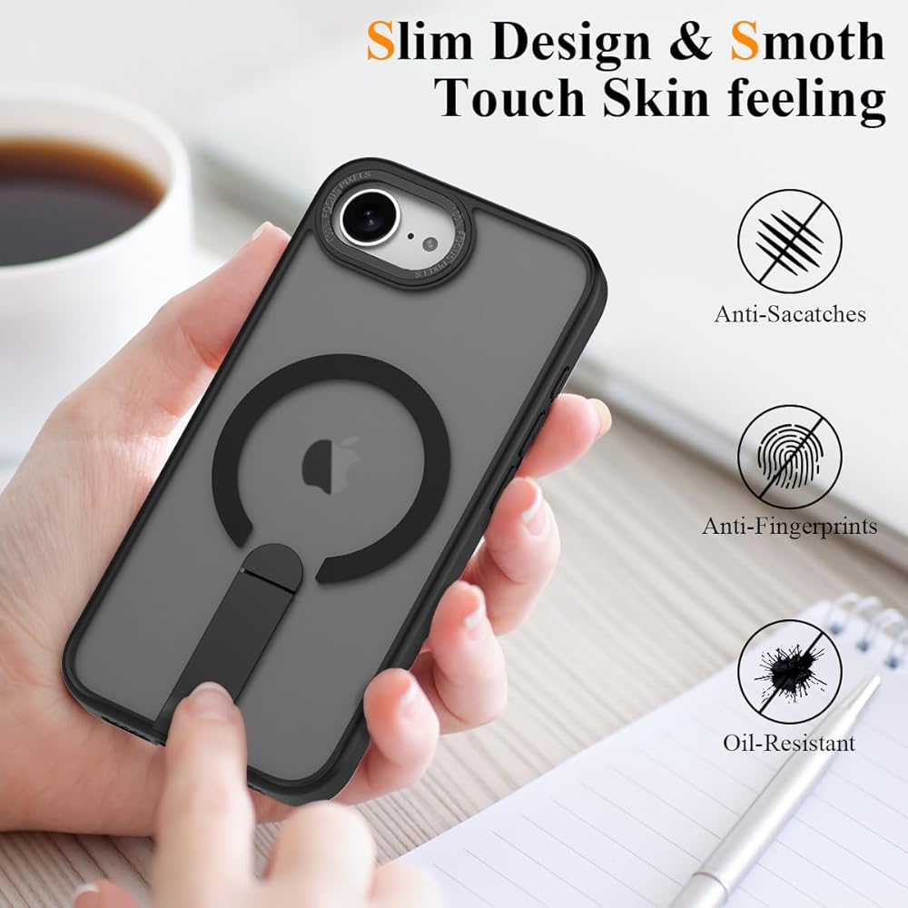MMHUO Magnetic for iPhone 16e Case with Screen Protector,[Compatible with Magsafe],[Skin Feeling],Slim Adjustable Kickstand Phone Case for iPhone 16e 6.1 inches 2025,Black