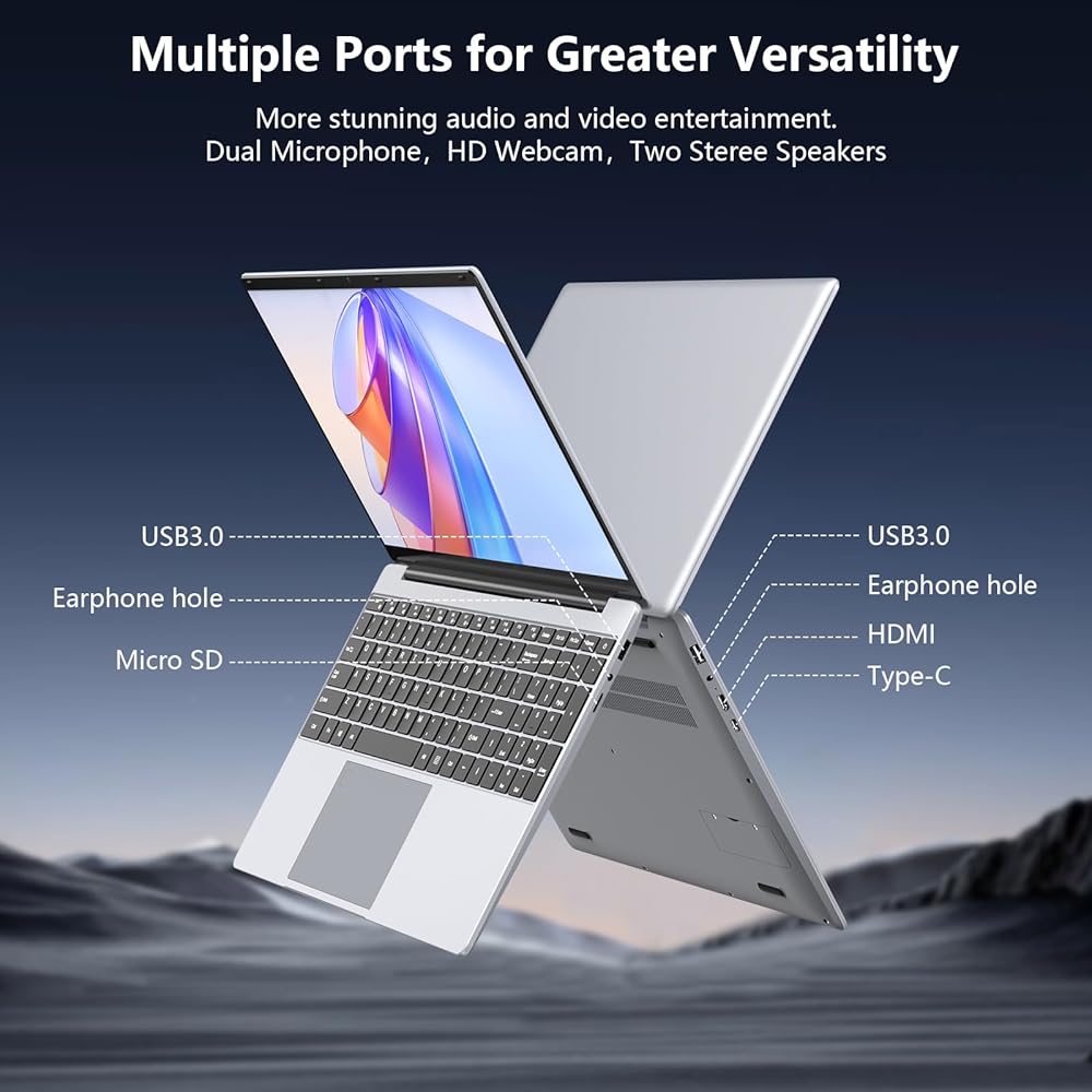 Abundant Interfaces:The portable laptop's got all the right ports, you know, like an TF card reader, a headphone and mic combo jack, two USB 3.2 Gen1 Type - A ports, a Full-Featured Type-C, an Mini HDMI port, and a DC power jack, and you can easily plug in all your external gear, like hard drives, projectors, headphones, mice, and whatnot, with these ports, so it's got you covered for whatever you need to do or add on.