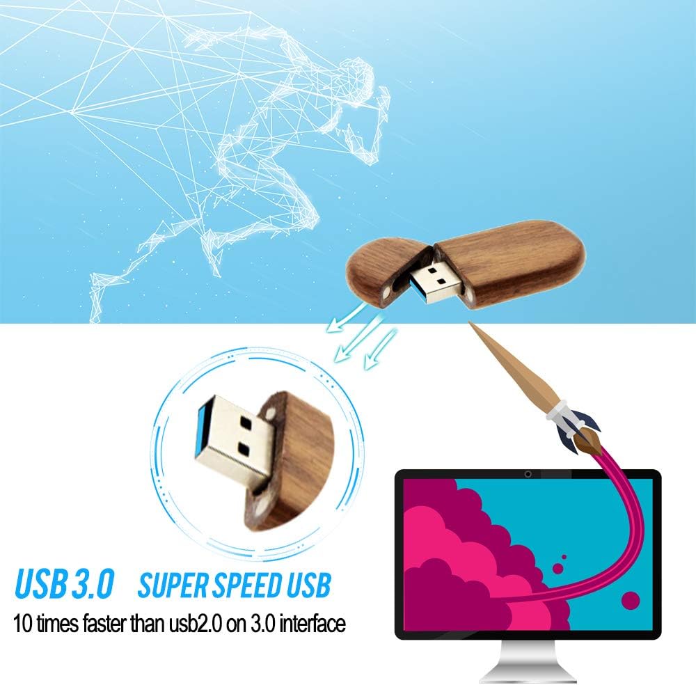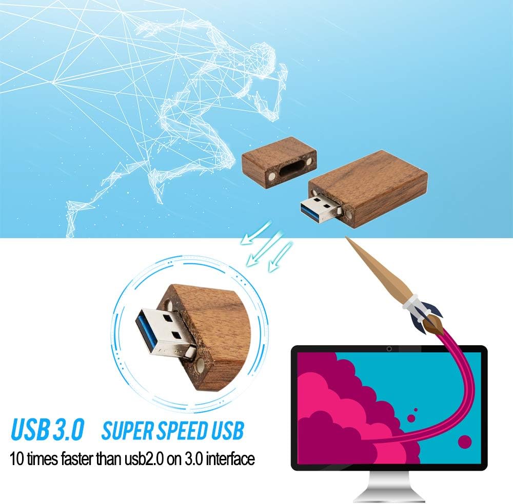 USB3.0 Super High Speed - 5 مرات أسرع من USB 2.0 ، القراءة تسرع إلى 100 ميجابايت / ثانية وسرعة الكتابة من 20 ميجابايت / ثانية إلى 35 ميجابايت / ثانية. لا يتطلب أي جهد لنقل HD Picrures أو مقاطع الفيديو في محرك أقراص فلاش USB الخشبي هذا