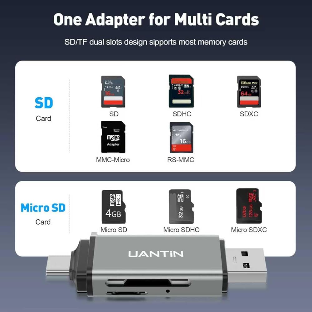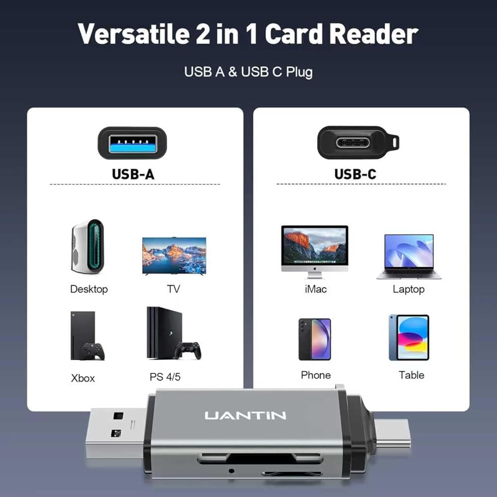 【Dual Card High Speed Read/Write】USB C and USB A card reader with built-in dual card slot design, compatible with SD, SDHC, SDXC, MMC, RS-MMC, Micro SD, Micro SDXC, and Micro SDHC cards in Camera/GoPro/Dash Cam/Surveillance Camera. Fast backup of photos, videos and large files with up to 5Gbps data transfer via USB 3.0 and USB C technology. Backward compatible with USB 2.0 【Wide Compatibility】Plug and play, no additional apps or internet connection required.USB C/A sd card reader works seamlessly with laptops, computers, smartphones and tablets equipped with type c/Thunderbolt 3, 4, 5 or USB-A 3.0/2.0, compatible with iPhone 15/16 series, MacBook Pro/Air 2016-2023, iMac Pro, Mac Mini, iPad Pro (USB C), Alienware 13/15/17, XPS 13-17, Surface Pro/Book2, Galaxy Tab Pro, Galaxy S9-S24 and digital cameras, Drones and most USB-C/A devices 【Dual card transfer drive】Dual card slot design can read and write SD card and micro SD card at the same time, eliminating the hassle of constantly switching cards to transfer data, saving time and doubling your work efficiency.USB-A and USB-C dual-header design makes this memory card reader ideal for photographers and video editors who want to manage files quickly and efficiently, as well as outdoor shooting enthusiasts.