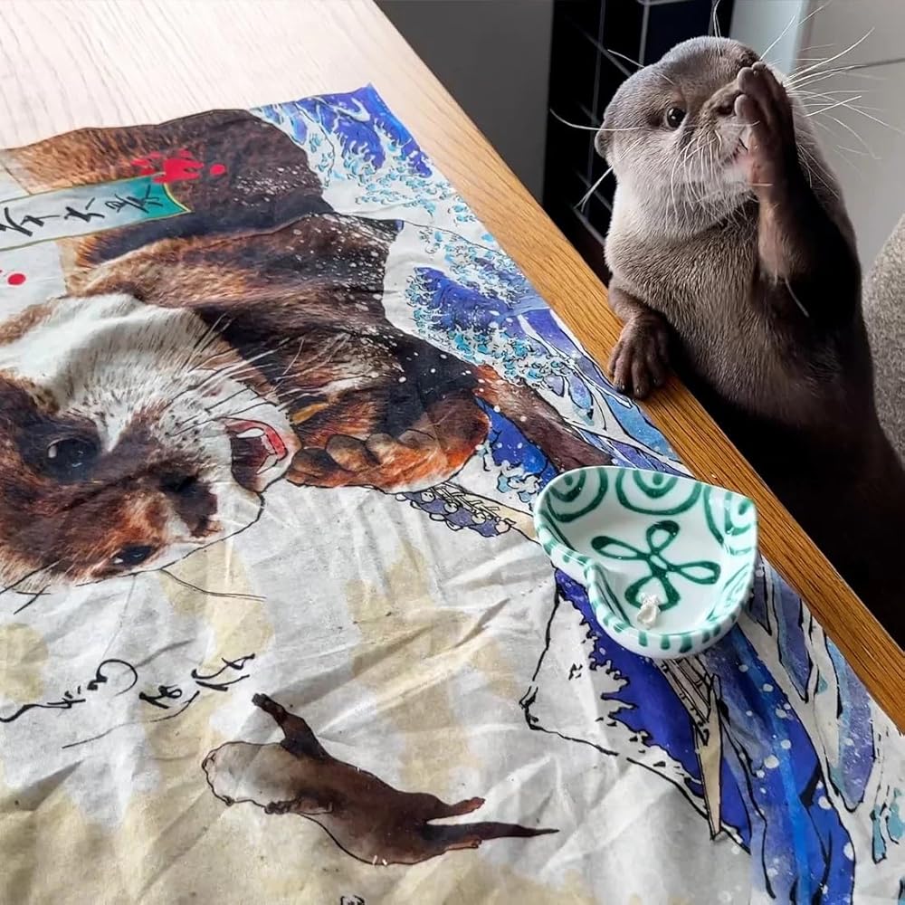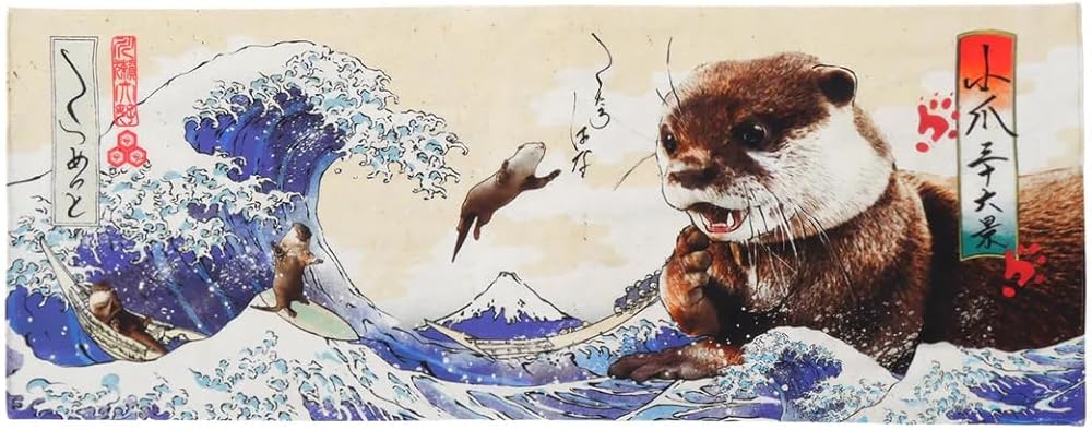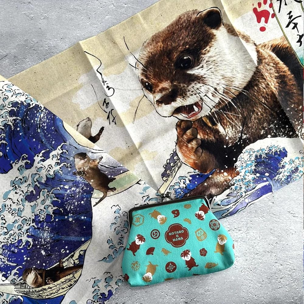 This set includes a Tenugui featuring otters Kotaro and Hana combined with Hokusai's "The Great Wave off Kanagawa" in the style of ukiyo-e paintings, and a Japanese-style mini pouch with a clasp and printed with an original KOTSUMET design. “Tenugui” are a type of traditional Japanese towel. Tenugui can be used in various ways. ・Use instead of a towel or handkerchief. ・Great for wrapping various items. ・Wear around the head instead of a bandanna or headband. ・Use instead of a place mat. ・Frame and display like a painting or textile. Other than the uses above, tenugui can be used in many more ways. If you want to know more information about Tenugui, please search "How to use Tenugui" on the Internet. (How to wash Tenugui) ・Please avoid washing hand towels with other clothes, as their colors tend to bleed. ・Leaving unattended for extended periods while wet may cause the color to fade. ・Do not use bleach when washing, avoid dry cleaning or using a dryer.