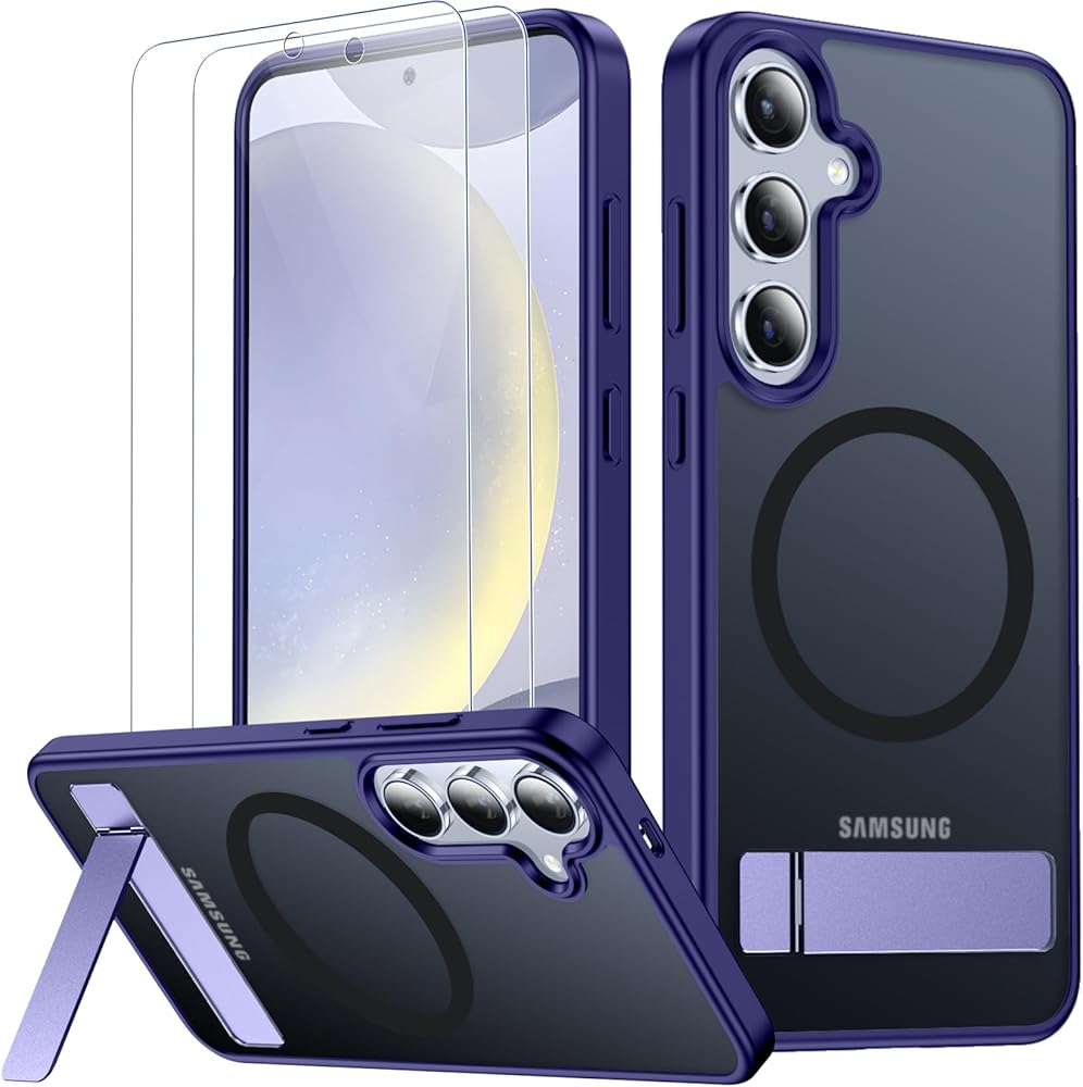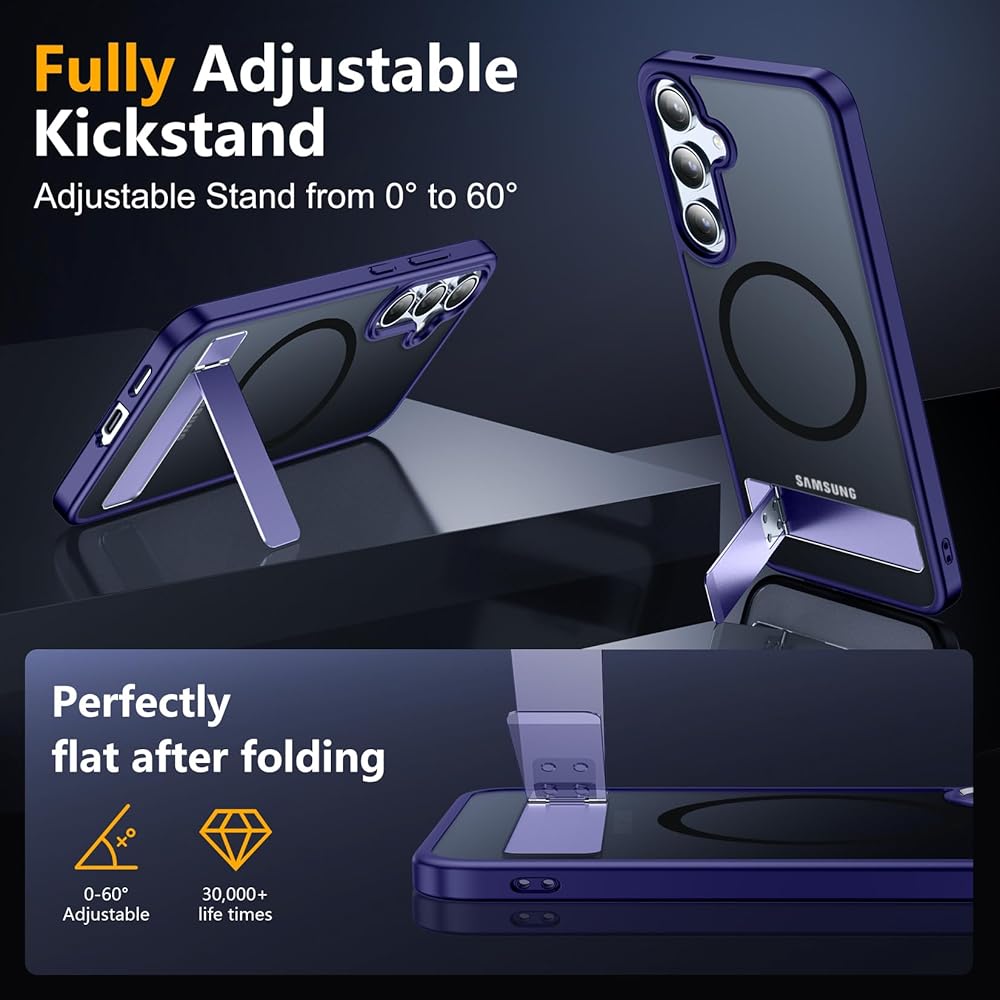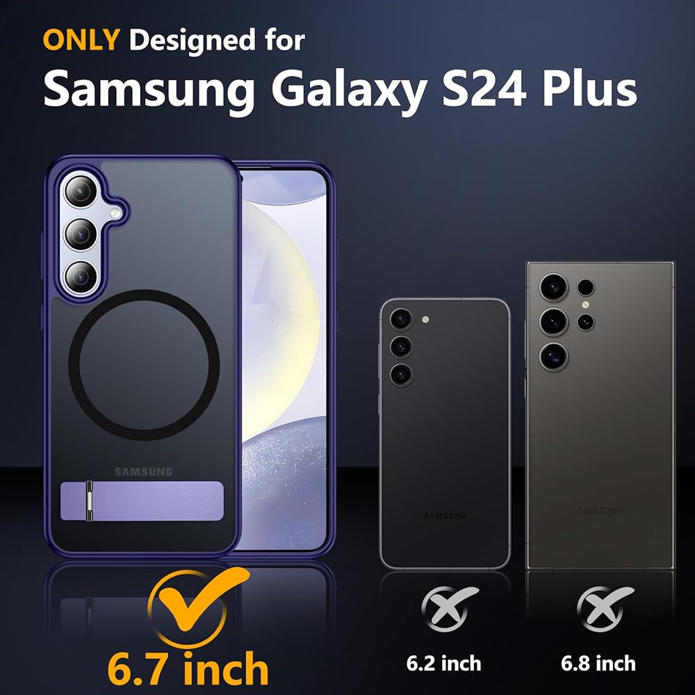 【Functional & Invisible Stand】The stand of the Samsung Galaxy s24 Plus case is foldable,sturdy and built to last,with built-in handy stand made by light and solid Aerospace-grade aluminum offering a sturdy and flexible portrait,landscape or conference call mode experience.It allows you to get a more comfortable viewing angle.Reduce the frequency of looking down at the phone screen to avoid hurting your back and neck.
