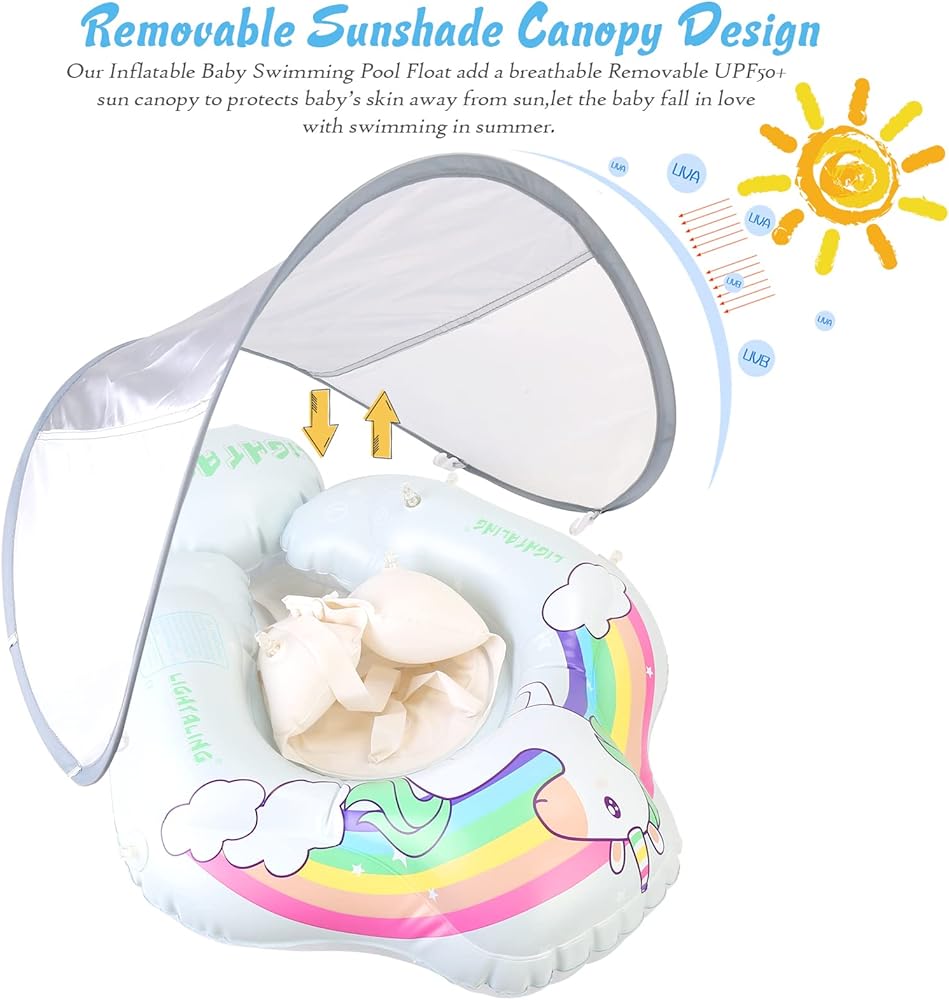【Baby Float with Sun Protection Canopy】Our Inflatable Baby Swimming Pool Float add a breathable Removable UPF50+ sun canopy to protects baby's skin away from sun,let the baby fall in love with swimming in summer.