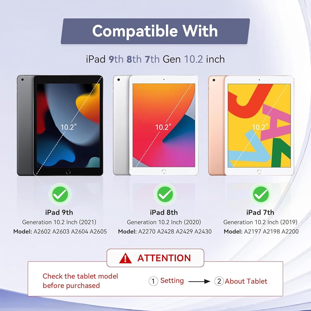 【Compatible Model】 This case is specifically designed for iPad 9th generation 10.2 inch, release on 2021 (Model: A2602, A2603, A2604, A2605), iPad 8th generation 10.2 inch, release on 2020 (Model: A2428, A2429, A2430, A2270), and iPad 7th generation 10.2 inch, release on 2019 (Model: A2197, A2200, A2198). It is important to verify your iPad model before purchasing. (Package NOT INCLUDE the pencil)