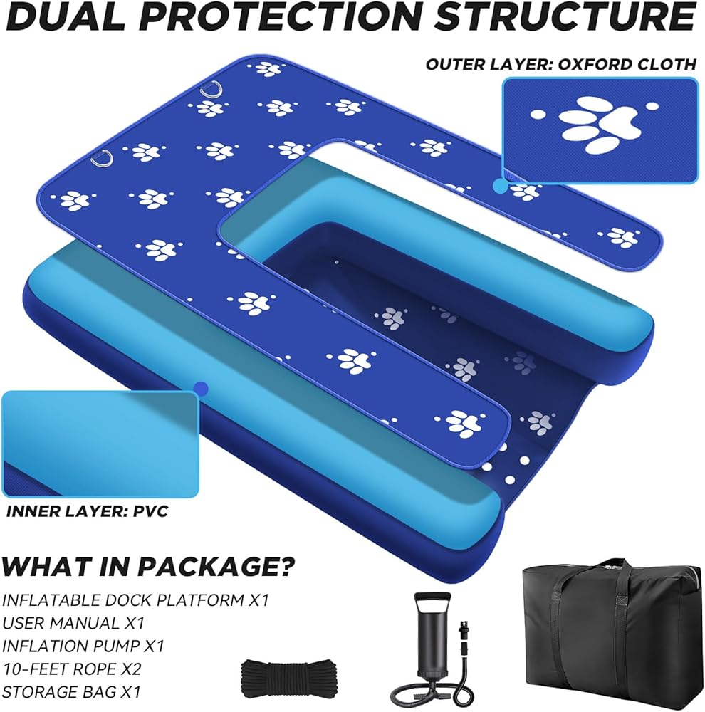 [Safety Inflatable Dock Platform] - The surface is made of anti slip Oxford cloth, which helps prevent slipping when climbing in and out of the water surface. Dual non-slip Oxford and PVC entry system combines stabilizing mesh, graduated traction platforms, and low-profile buoyancy control. Ensures confident water entry/exit for dogs of more sizes while preventing ramp displacement