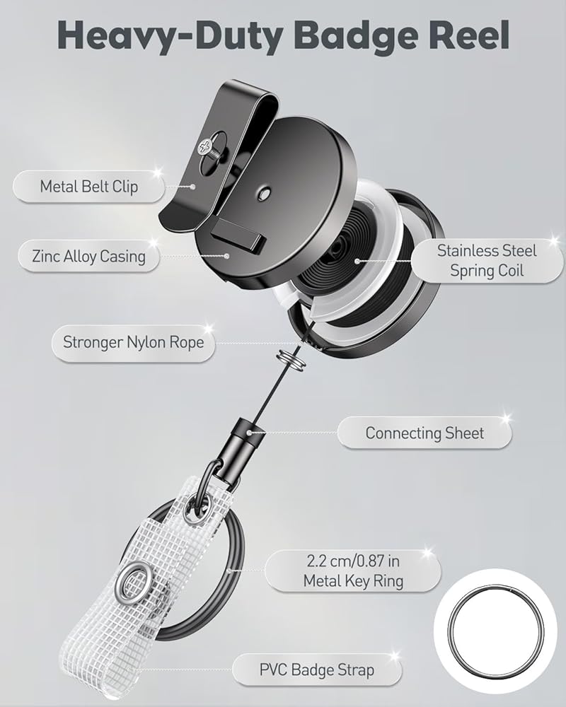 Retractable Badge Reel: Reliable built-in stainless steel spring coils with strong retraction force. Ideally endure pulls over 10,000 times and hold up to 11 oz without falling