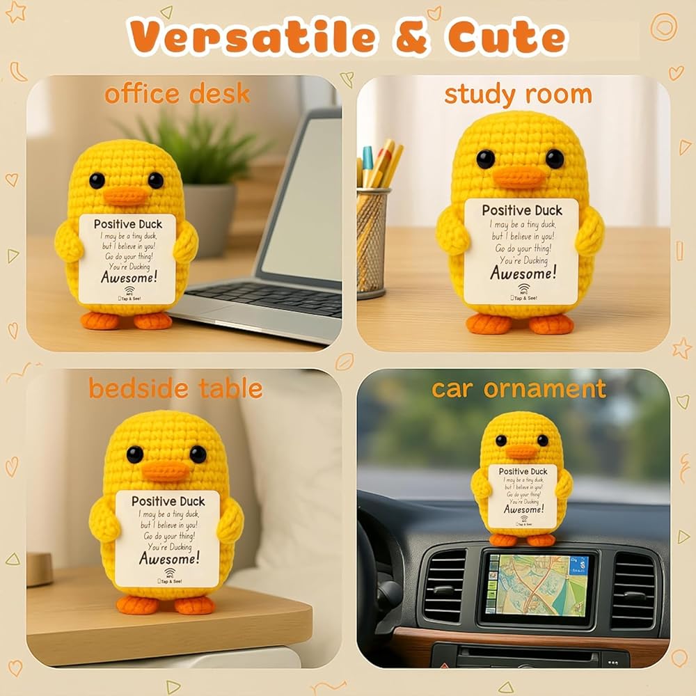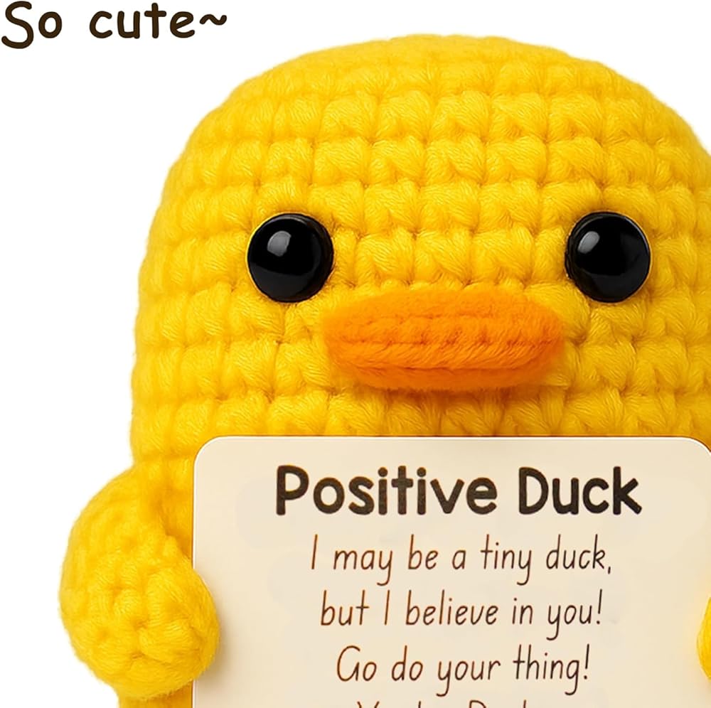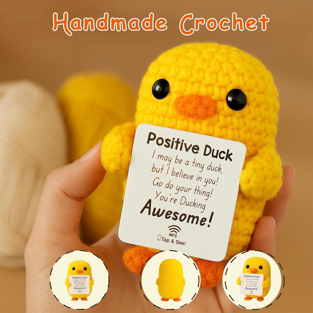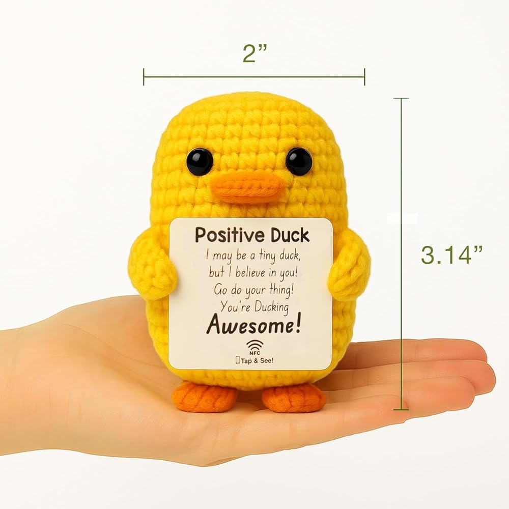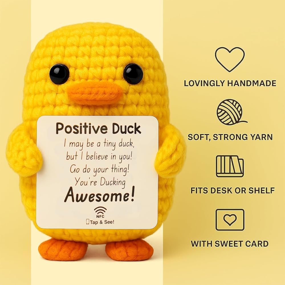 Positive Duck Plush with Inspirational Message – Cute Stress Relief Gift for Women, Coworkers, or College Girls – Emotional Support Crochet Duck with NFC – Pick Me Up Small Gift