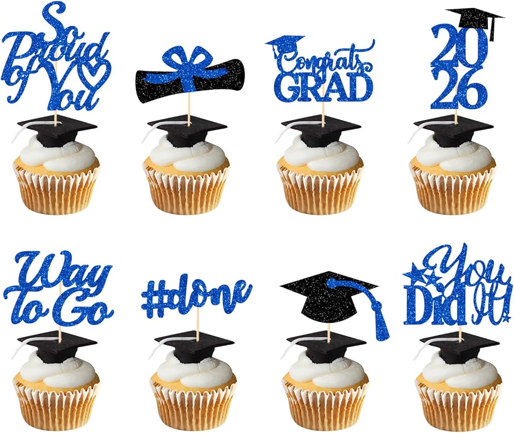 Graduation Decorations 2026 Blue, Graduation Cupcake Toppers 2026 Blue Black, Glitter Class of 2026 Cupcake Toppers Supplies, Class of 2026 Congrats Grad Cap Diploma Cupcake Picks - 40Pcs