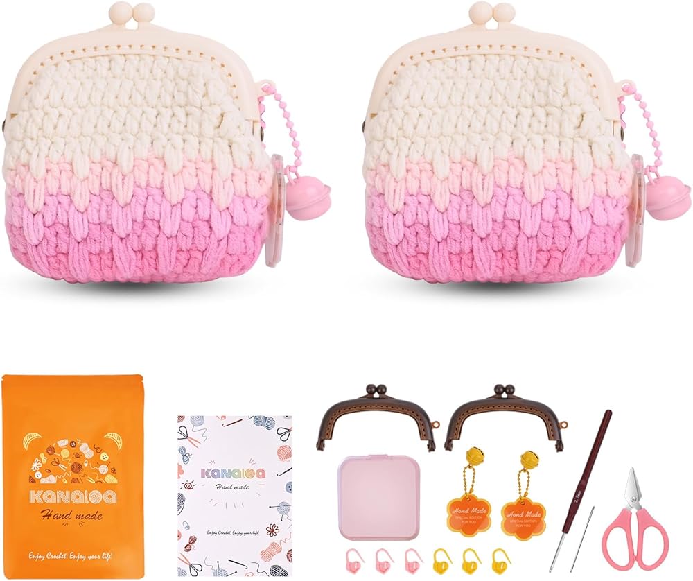 【All-In-One Crochet Starter Kit】you'll receive every other tool you'd need to begin crocheting with our kits,also comes with a paper instructions,brand yarn with order of numbers,two Kisslock Clasp Wallet Accessories,a ergonomic crochet hook,a pair of scissors,a little storage box(holds 2 sets of bells + tag accessories,six stitch markers,a needle),and a bag that holds it all.Please note that we have a variety of retro and gradient colors available.Each crochet kit can be made into two finished products.We can also sell finished products.