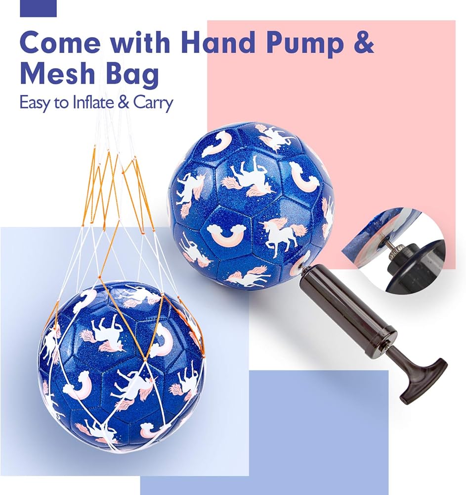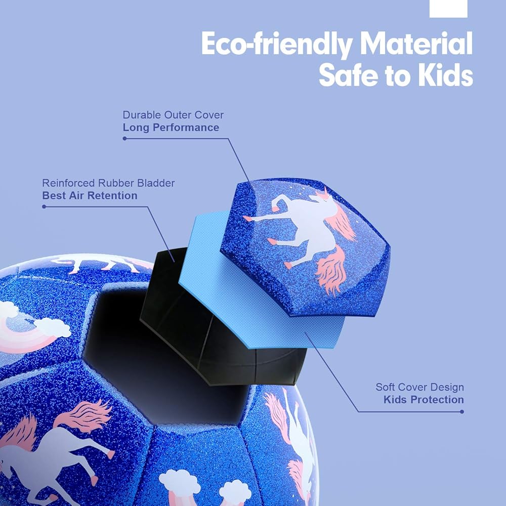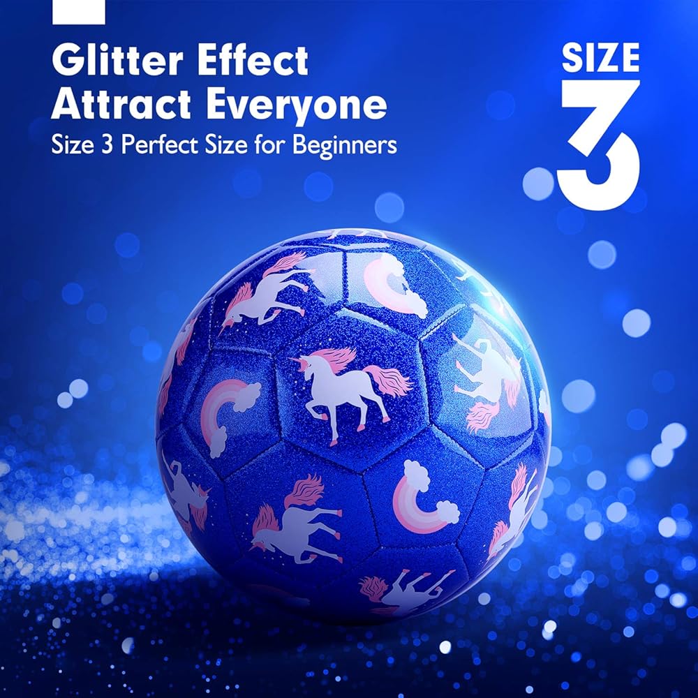 【Popular Glitter Element Unicorns & Helps with Fitness and Health】The unique glitter surface glistened in the sunlight, will stand out on a grass field for which it is intended. The fun design will have your children wanting to play soccer daily, and sure to capture even the most distracted toddler's attention. Soccer can help to strengthen core muscles and bones, improve cardiovascular health, increase coordination & flexibility. So it will be optimal outdoor toys for kids ages 4-8 8-12.
