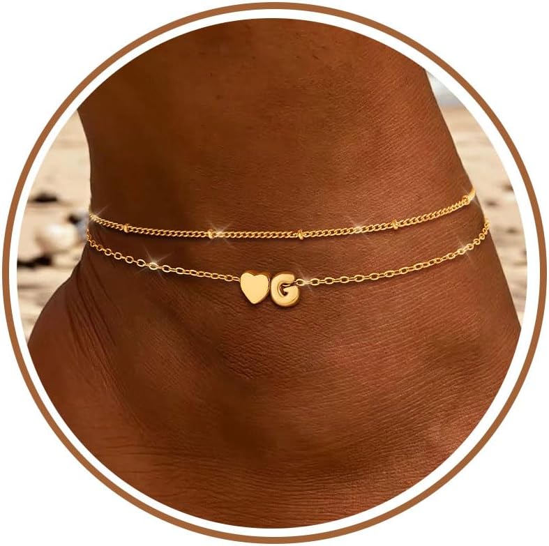 INITIAL ANKLET FOR WOMEN : You'll receive two dainty anklets: a gold beaded chain anklet and a heart initial ankle bracelet, you can wear them alone or stacked! The unique design combines heart charms and 26 letter (A-Z) charms, adding a sweet personalized touch. These dainty ankle bracelets for women are the perfect addition to your summer jewelry collection