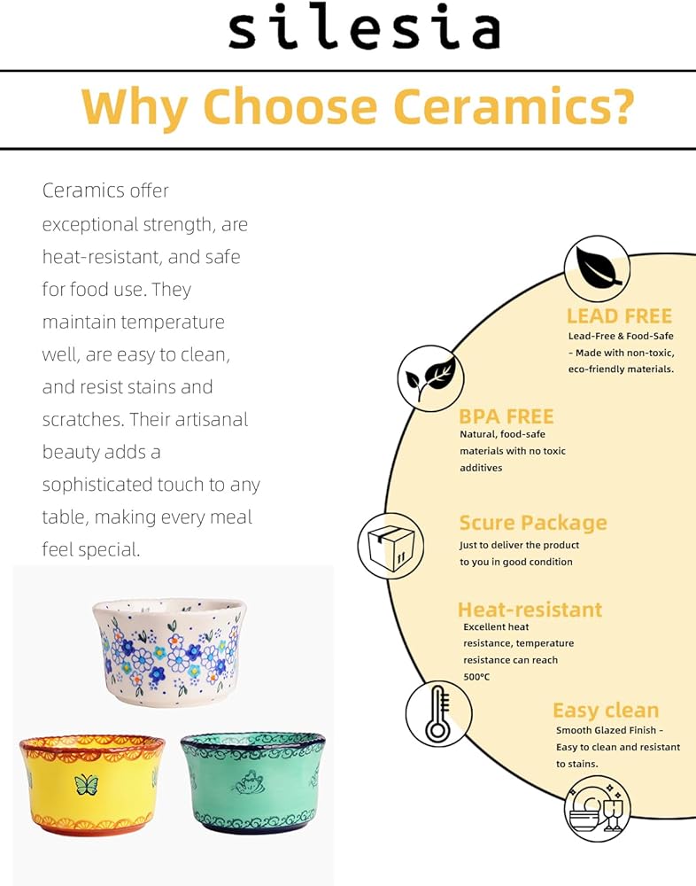 Ceramic Material: Made from lead free ceramic, They are built to last while maintaining their vibrant hand-painted designs over time