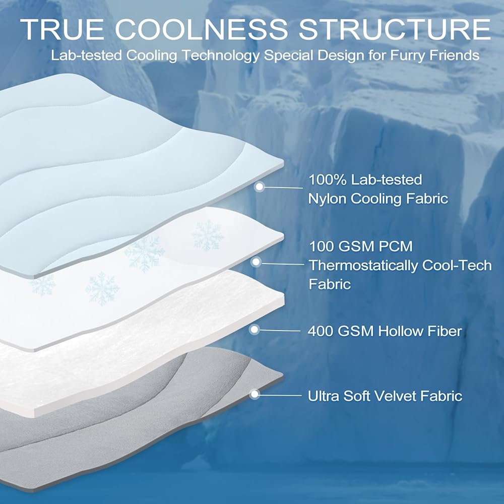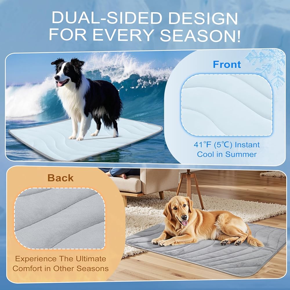INNOVATIVE REVERSIBLE DESIGN: Our upgraded cooling dog mat adopts double-sided design, with 100% nylon cooling fabric on the surface, 500gsm glue-free cotton filling inside and corrugated quilting to keep the surface flat and comfortable. The back side features soft and warm velvet, ensuring your pet can use it in every season
