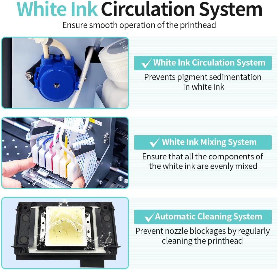 Three Advanced White Ink System:White ink circulation system,white ink mixing system and automatic print head cleaning system.These systems help ensure smooth operation of the print head, reduce jamming and nozzle damage, and improve work efficiency.