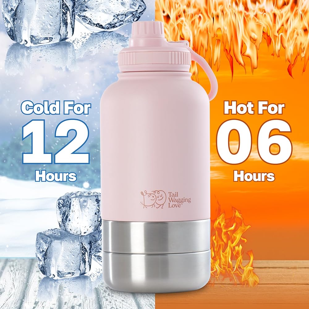 32oz 3-in-1 Travel Water Bottle for Dogs & Humans, Dual Use, Stainless Steel, Keeps Water Hot 6hrs/Cold 12hrs, Leak-Proof with Detachable Food & Water Bowls, Perfect for Travel