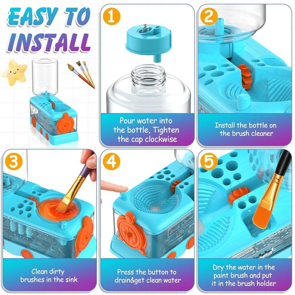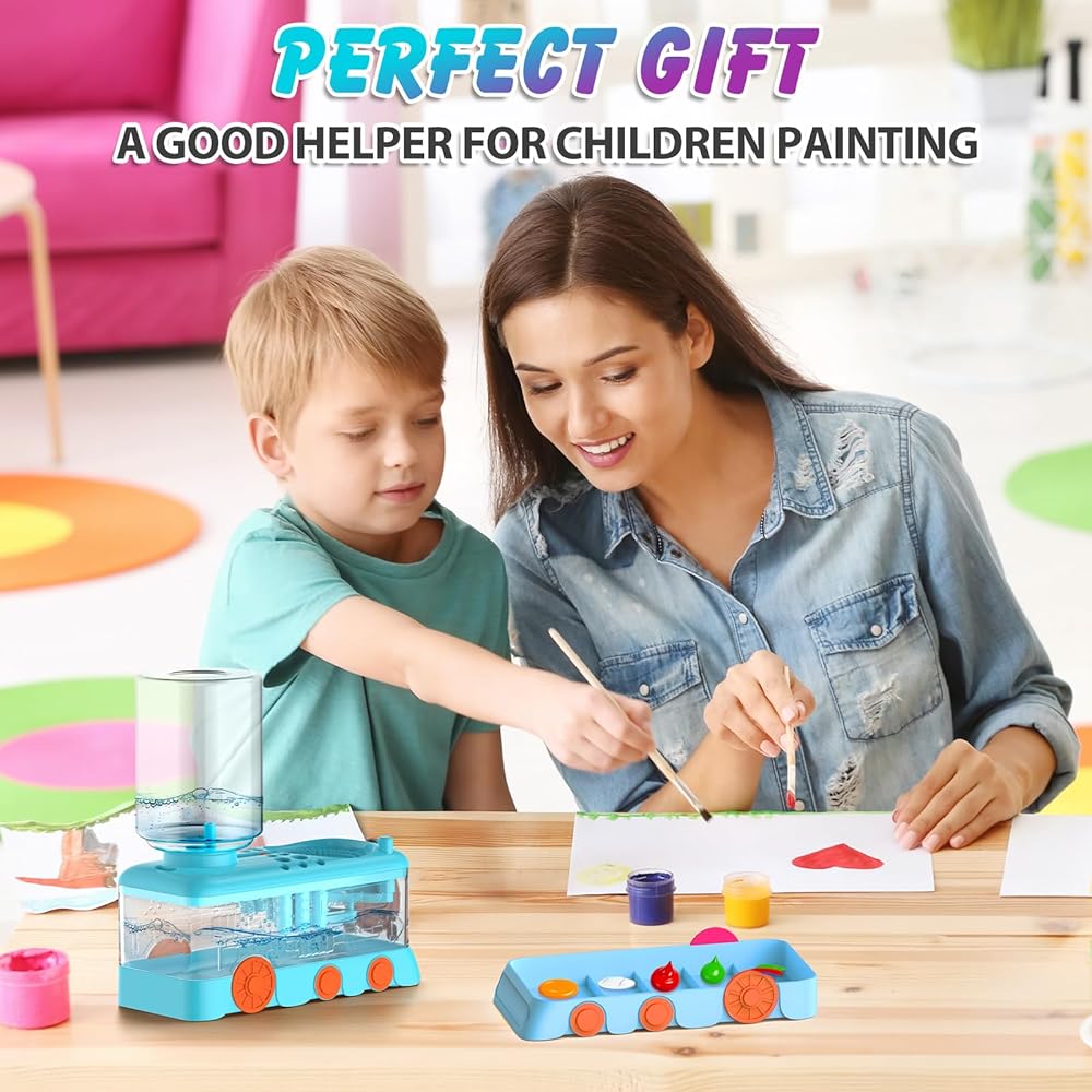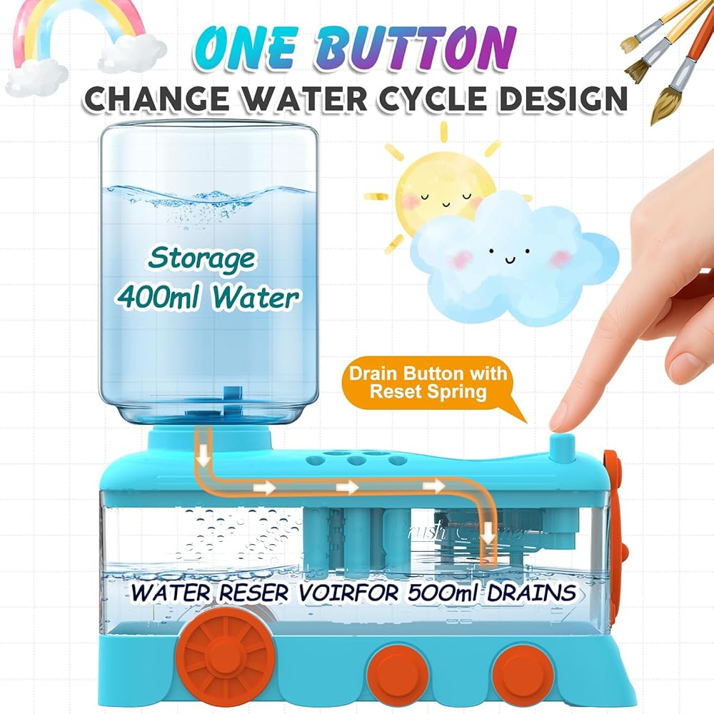 [The Upgraded Cartoon Paint Brush Cleaner]Differ from the traditional one, the upgraded version has improved in 4 aspects. 1. The cartoon design is more likely to arouse children's interest in painting; 2.the new version adopts a threaded design to prevent water leakage better; 3. The Paint Tray has a larger area and are distinguished; 4. The number of paint brush holders has been increased, and the size has been distinguished, which can accept more brushes of different sizes.