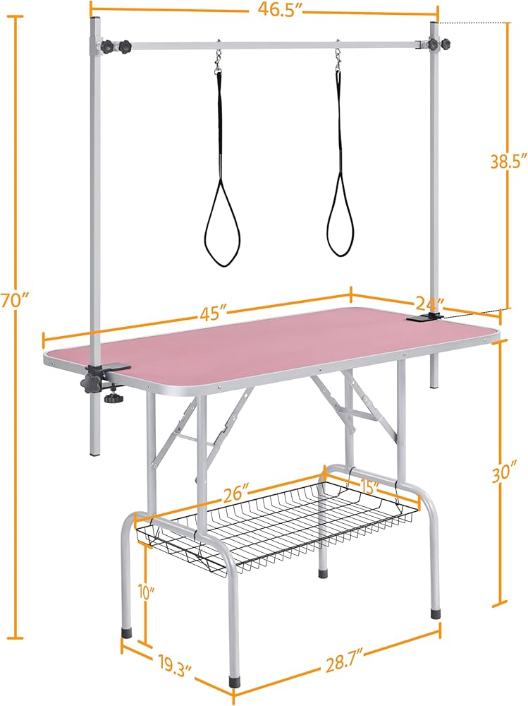 Retractable table legs: The legs of the dog grooming table are retractable so that you can fold them back to the center part for saving space. This retractable design makes this table convenient to use, organize and carry without taking too much space.