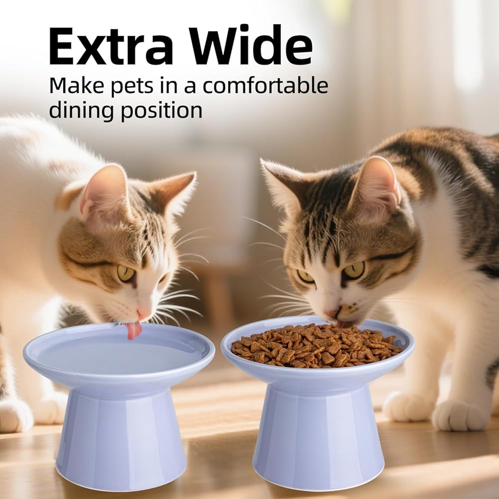 [Extra Wide & Shallow, Whisker-Friendly Design] The raised cat bowl itself is both wide and shallow enough not to trigger whisker fatigue. It gives even big cats easy access to wet food or kibble, while the tiny inner lip reduces the chance of food getting pushed out of the bowl. Great height for comfortable eating. 6.2” wide, 4.5” tall.