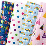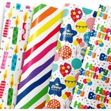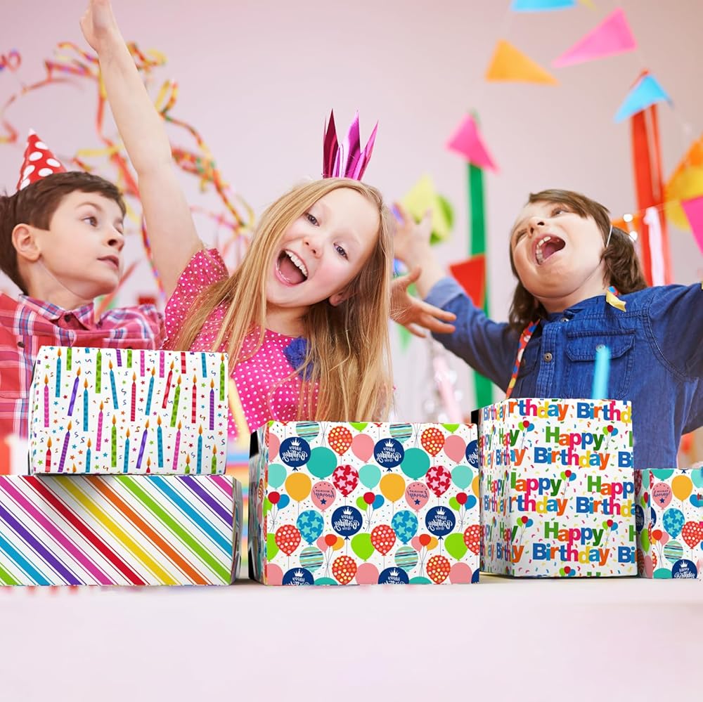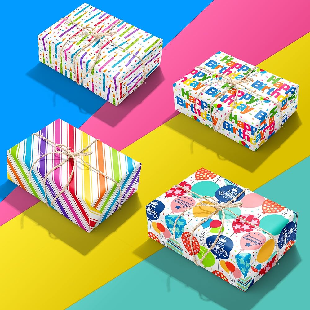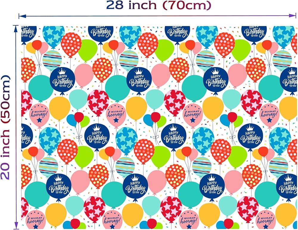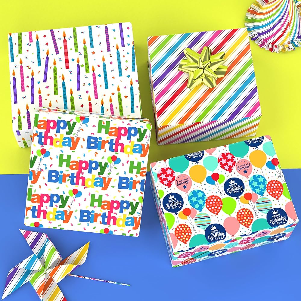 Eye-Catching Designs: The birthday wrapping paper sheets feature 4 designs: "Happy Birthday" lettering, Birthday candles, balloons and colorful stripe. These colorful and cheery gift wrap will add a cute touch to your Birthday presents!